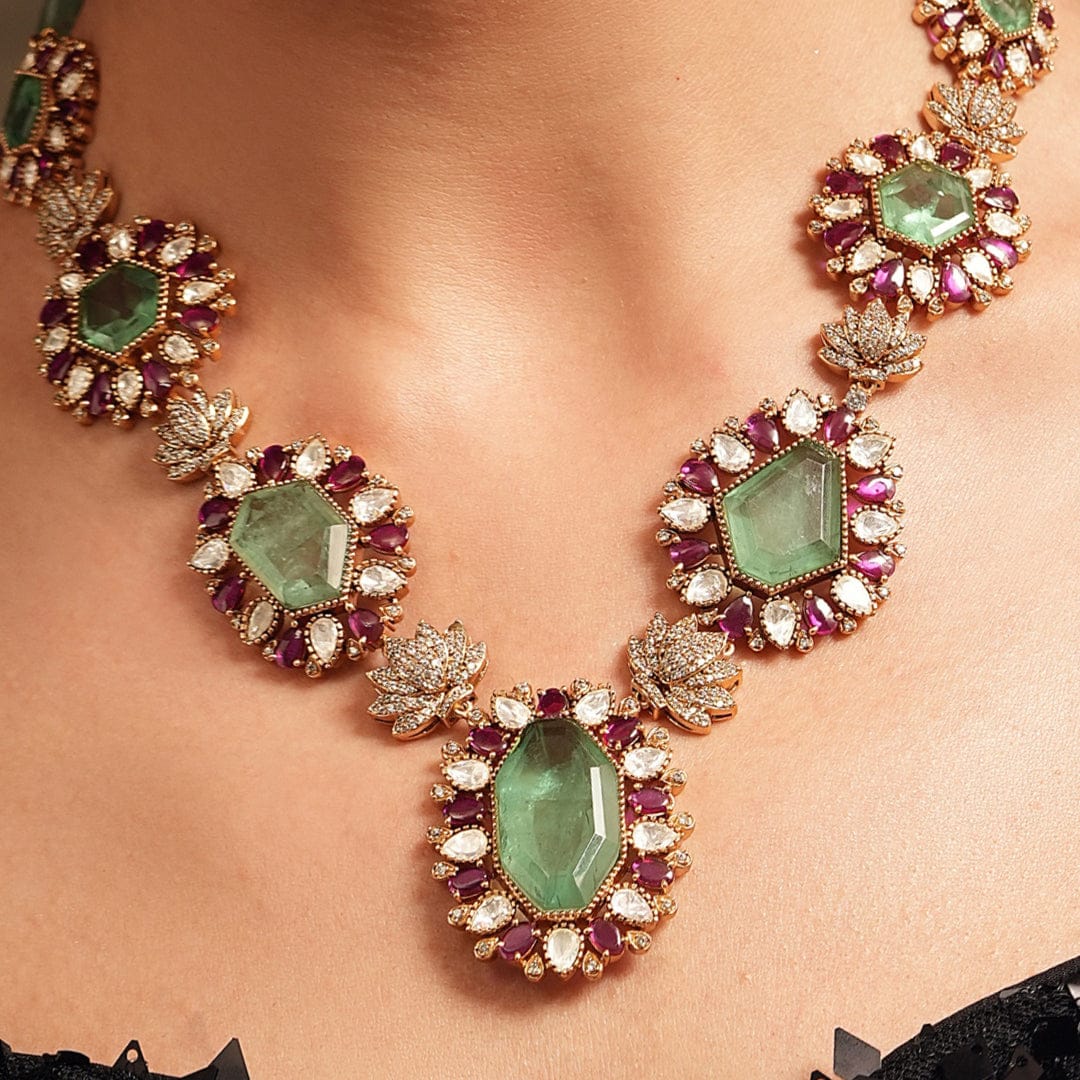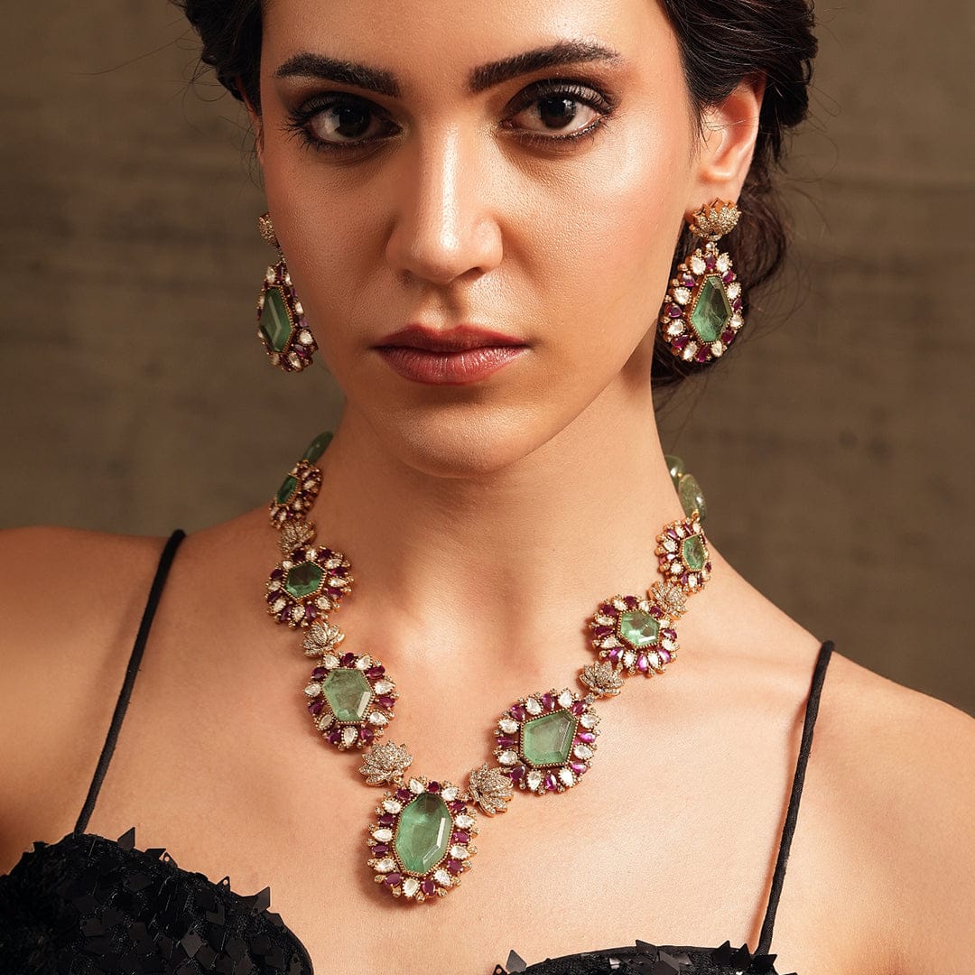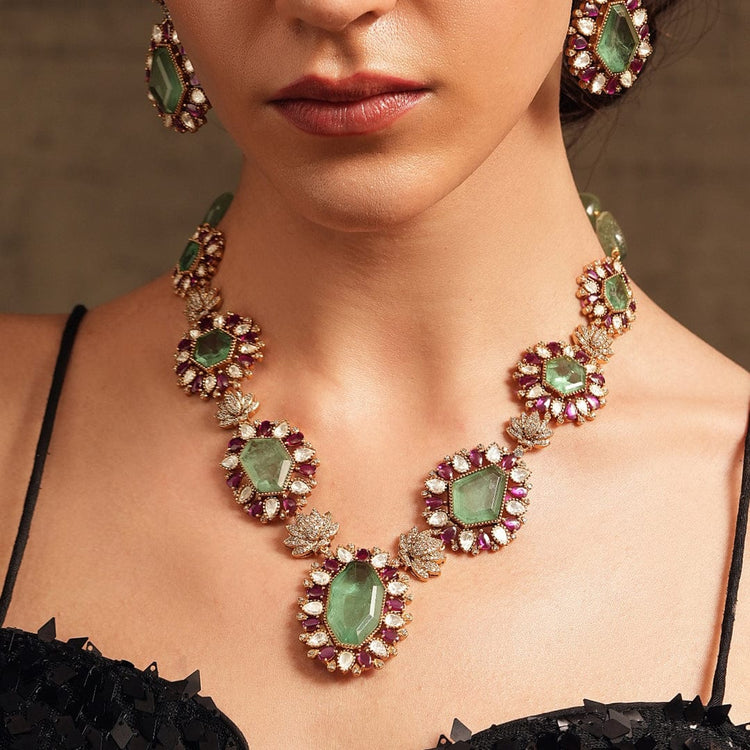 Description: An antique-inspired gleaming necklace set featuring green and pink stones, designed in the elegant Victorian style. The intricate detailing and rich colors make it a timeless statement piece for formal and festive occasions.