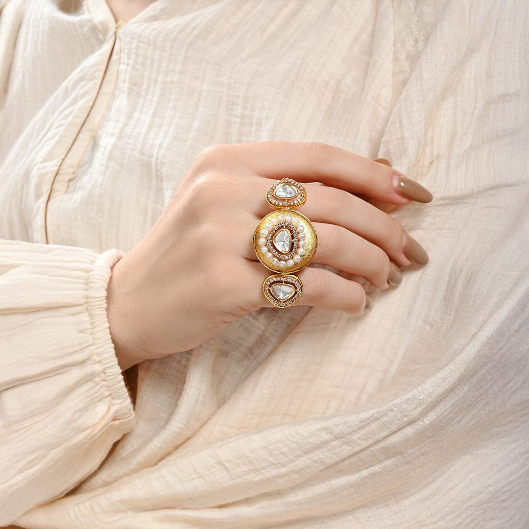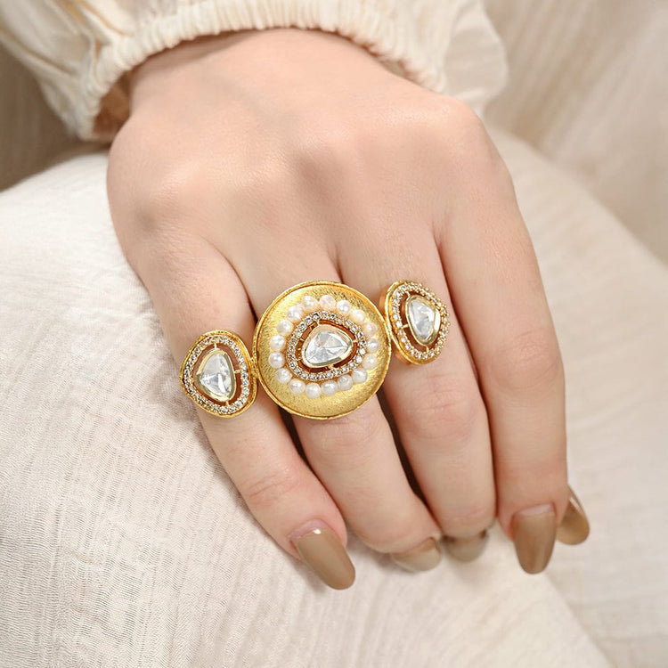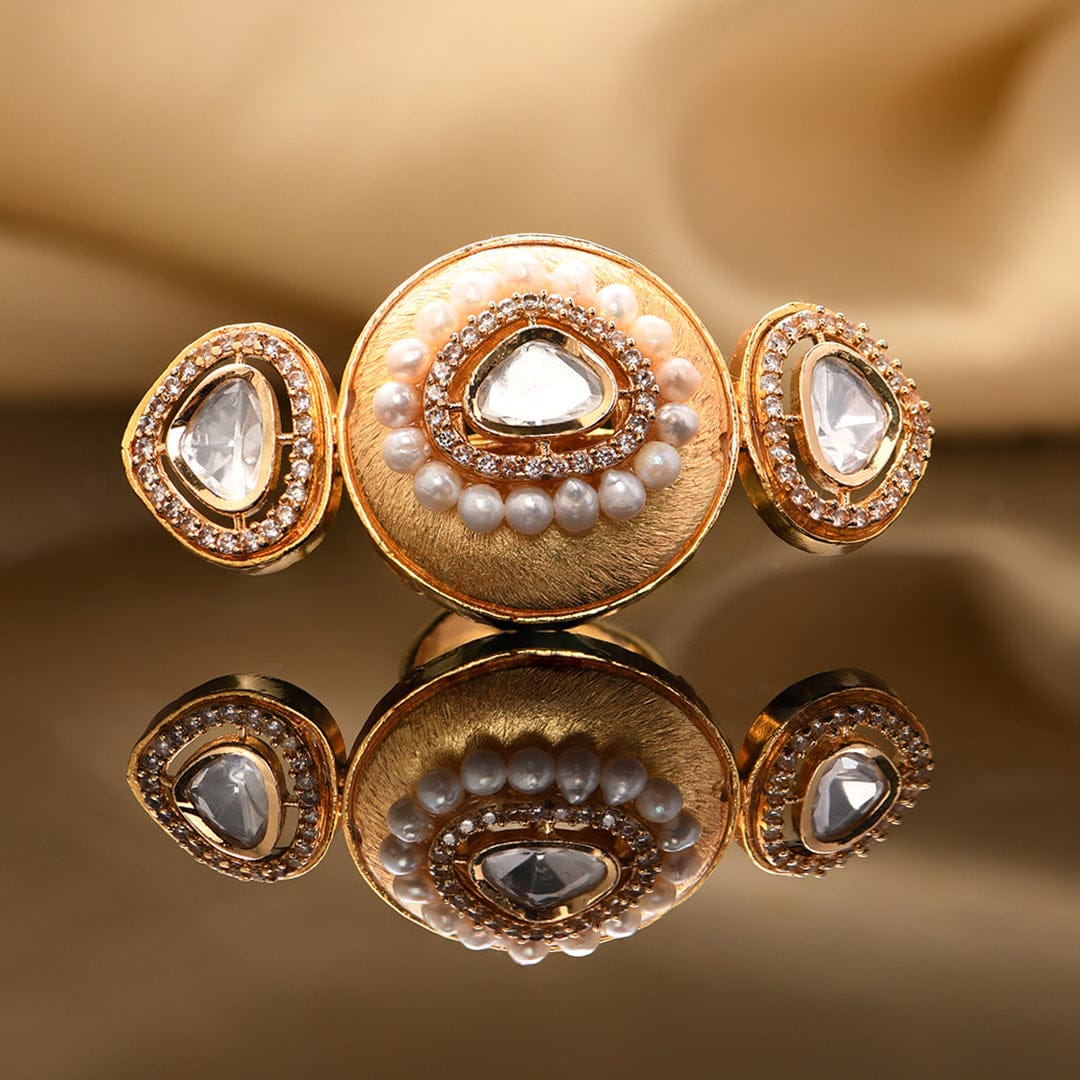 Description: Embrace delicate enchantment with our polki ring, a true work of art delicately plated in 22kt Gold plated brass. The ethereal placing of fresh water pearls adds a touch of poetry to this unique piece, making it a symphony of sophistication and style.Elevate your perfect outfit with this timeless petite beauty that adds that extra touch of drama to your style." Product Code: JBRRG1FB24