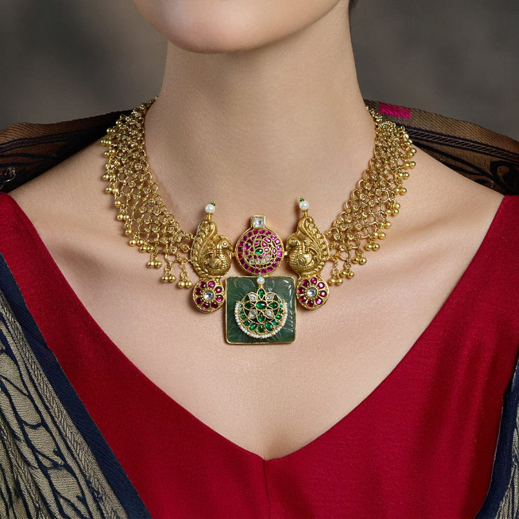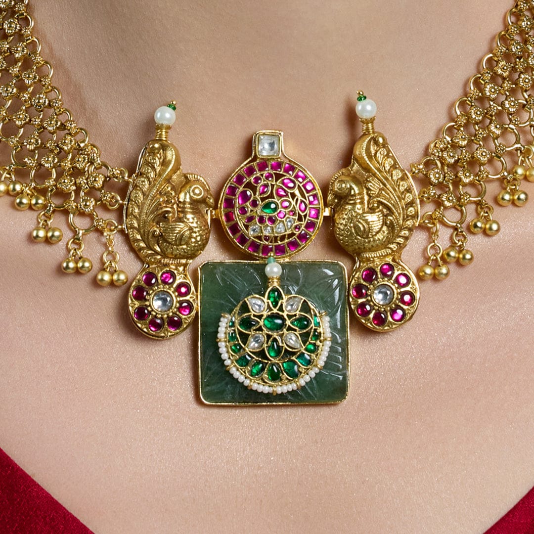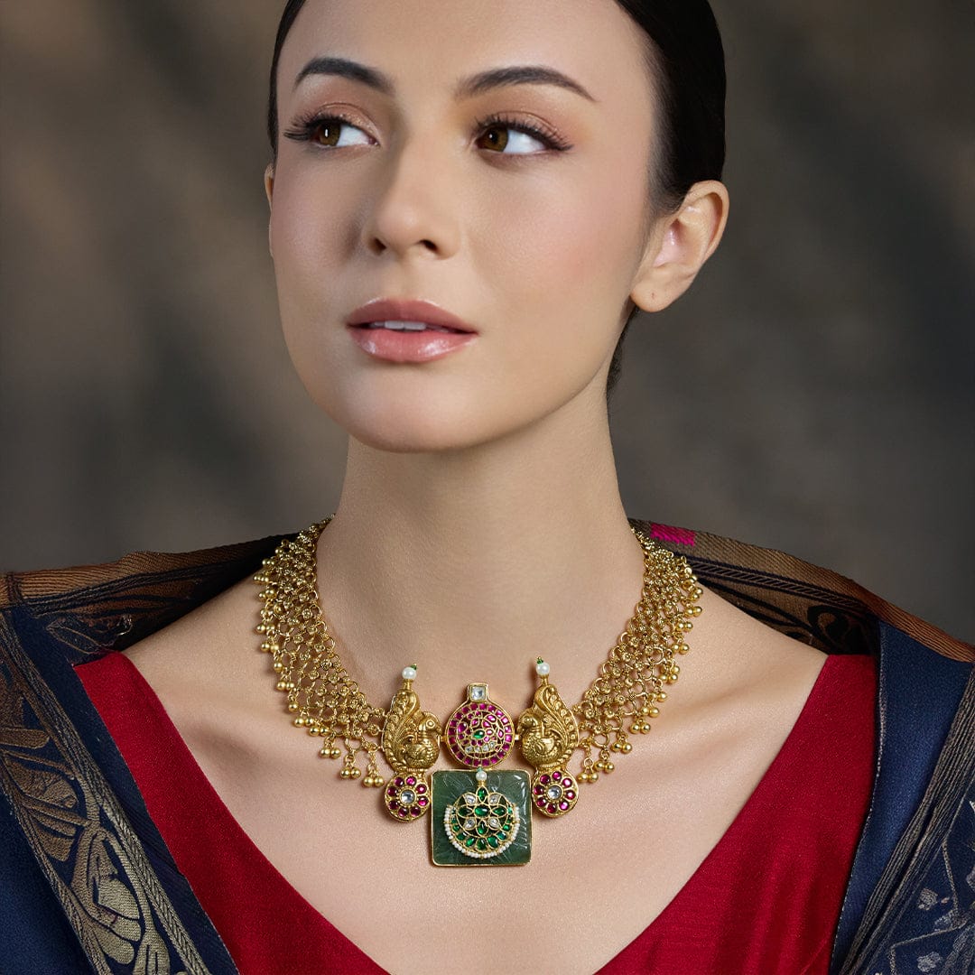 Description: Temple coin Necklace is a fusion of heritage and color. This finely designed necklace features floral work and traditional charm—perfect for ethnic ensembles and festive elegance.