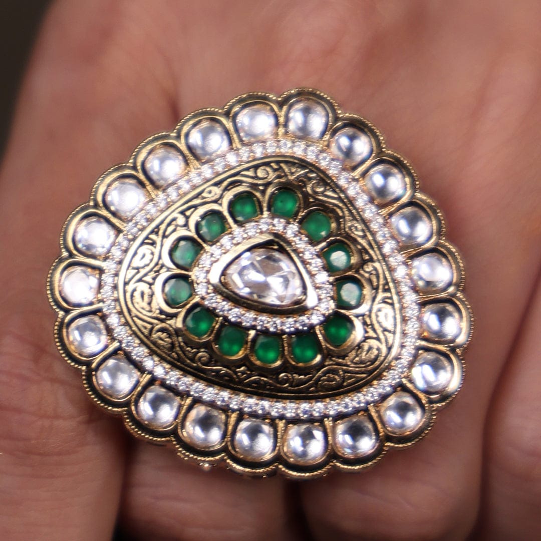Description : A Gold-Plated Kundan and Green Enamel Ring that elevates your ethnic look. Perfectly designed for timeless elegance with dazzling kundan stone setting, bordered with rich green enamel work that adds a regal charm. It is a versatile charm that adds beauty to your wardrobe