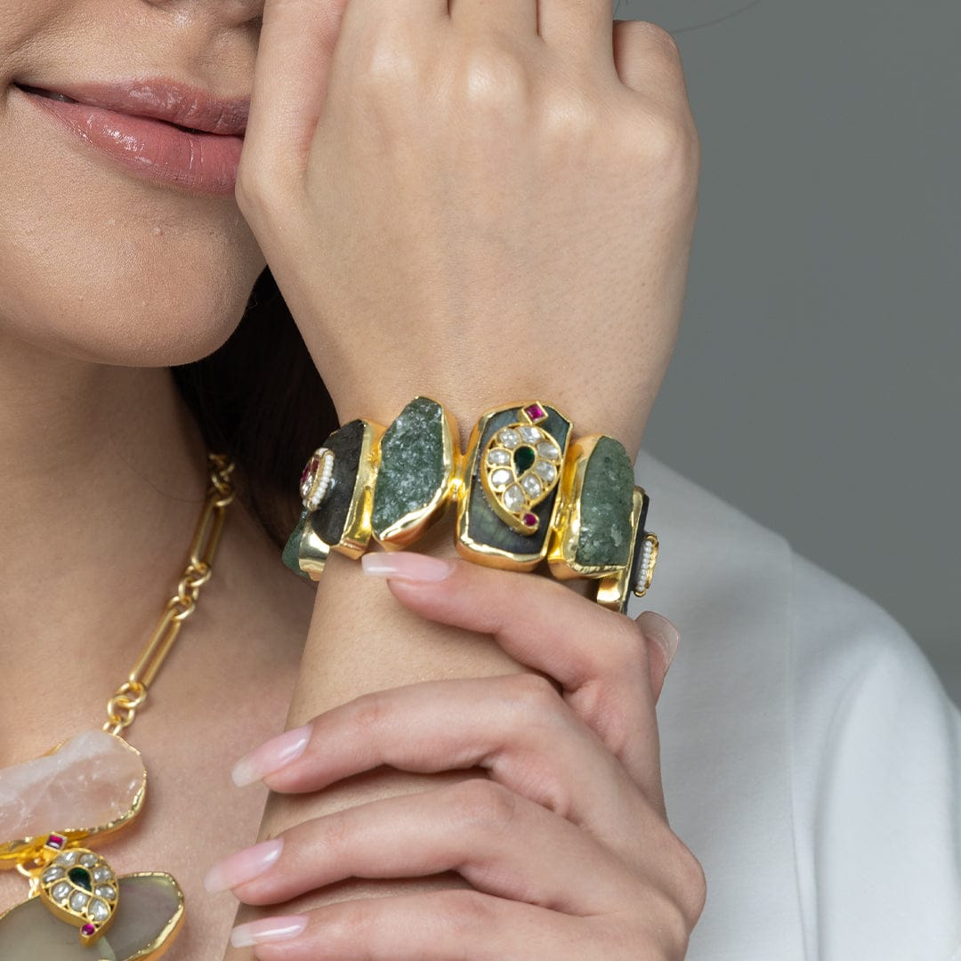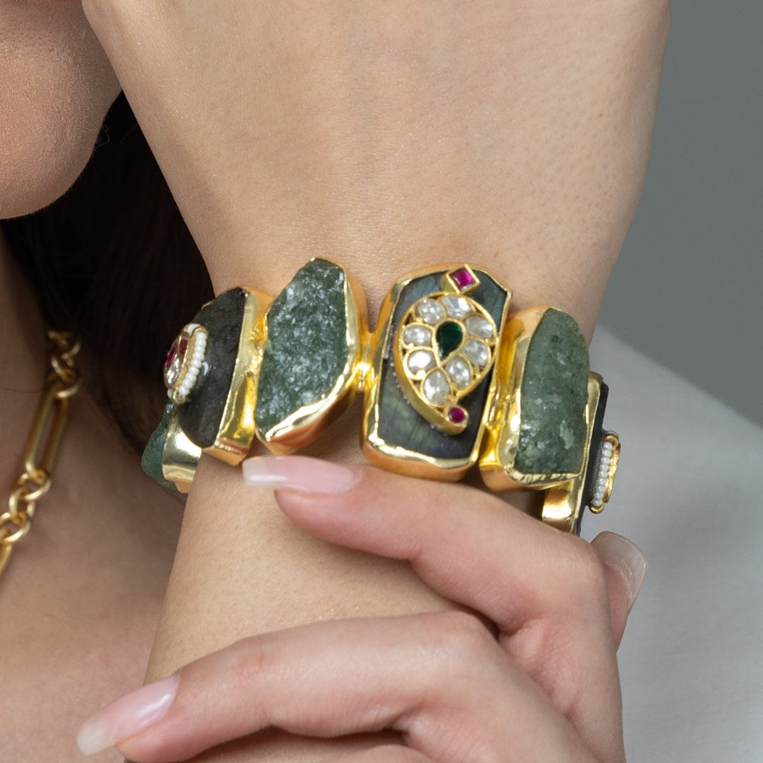 Description : This unique, open bracelet features multiple large, rough-cut green and dark stones. A central decorative element with clear, red, and green accents completes this striking, organic statement piece.
