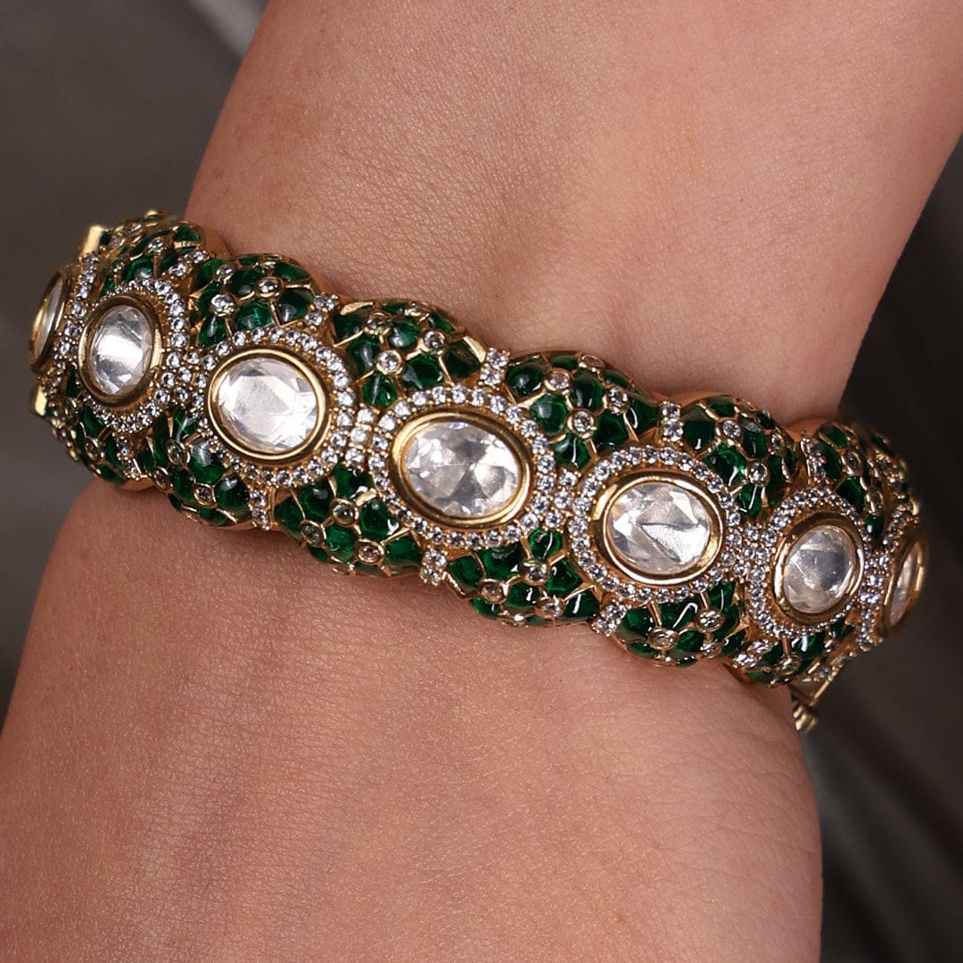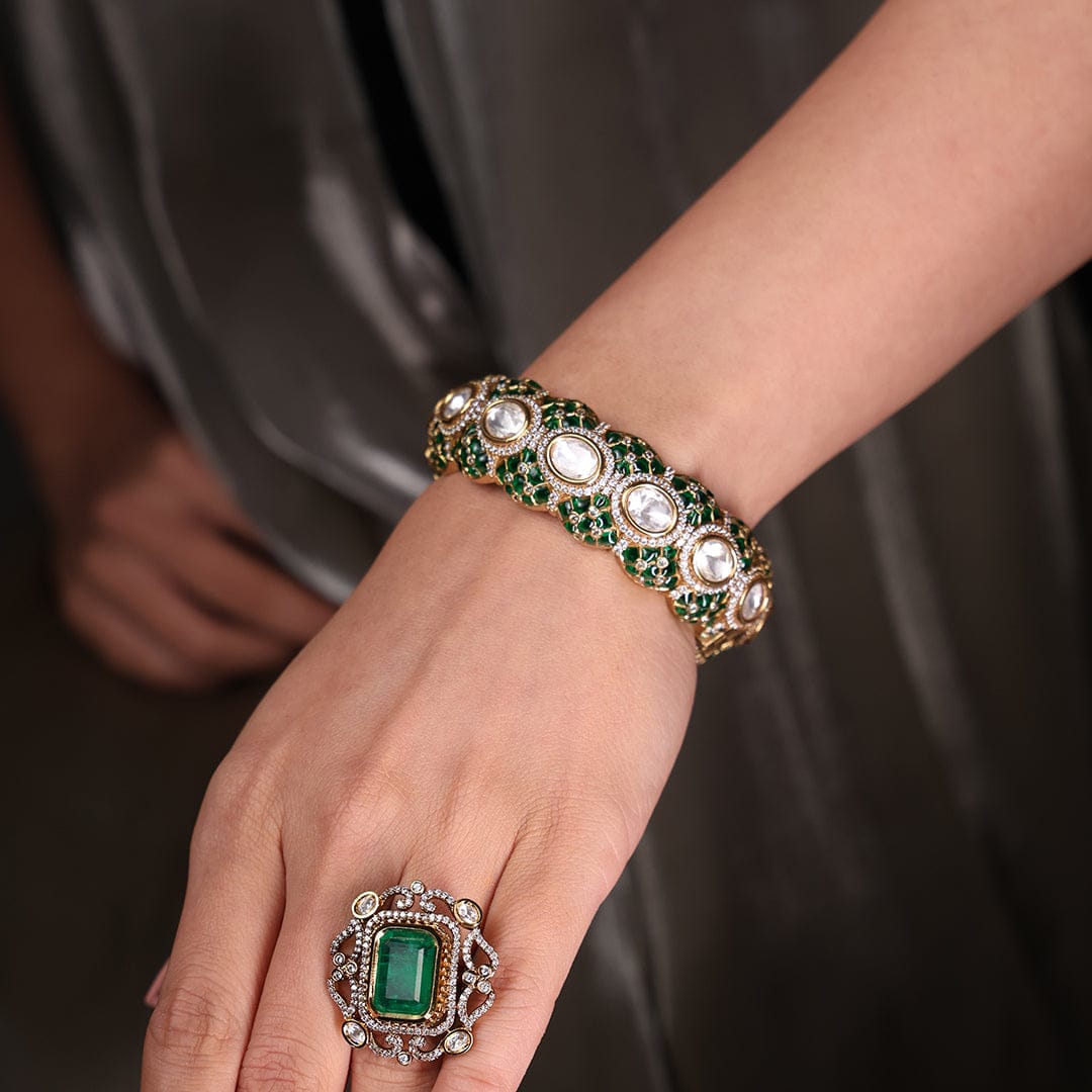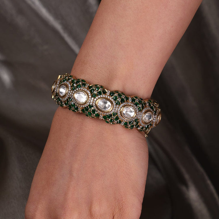 Description : Adorned with vibrant emerald stones and delicate kundan details, the Emerald Grace Bangle reflects regal beauty. A must-have accessory for festive outfits and elegant gatherings, it radiates timeless sophistication.