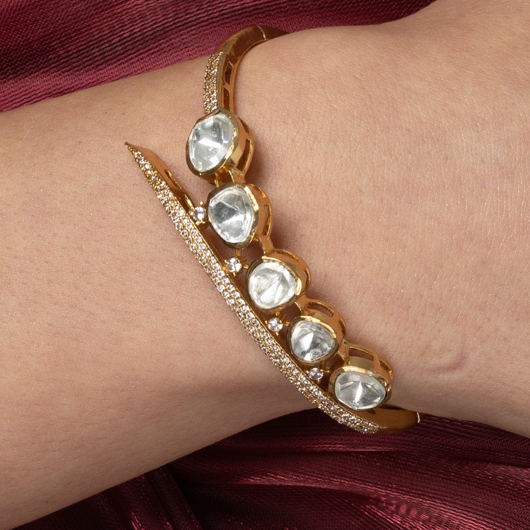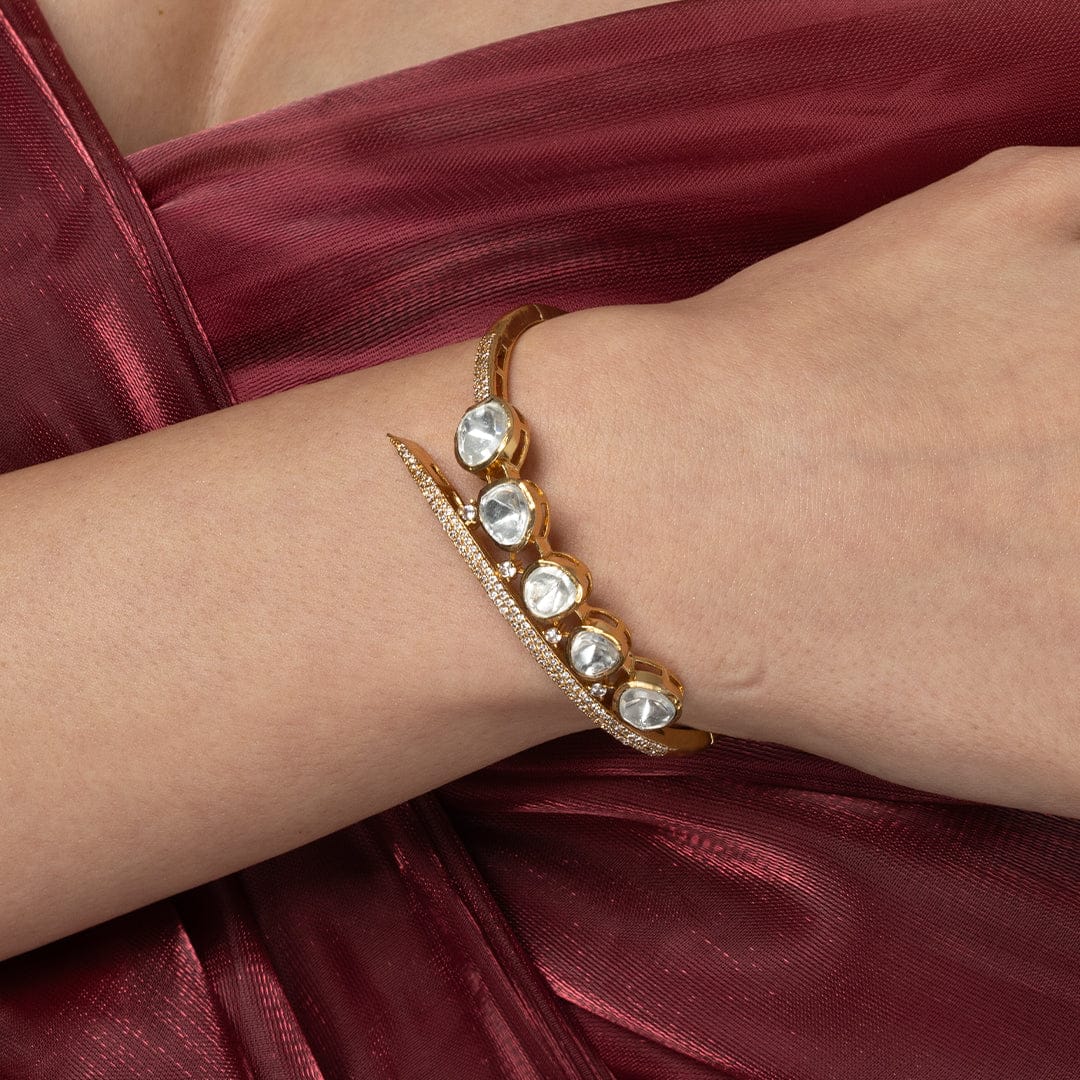 Description : Adorn your beautiful hands with our gold-plated bangle featuring a single design. The ornament has five large, clear, marquise-cut stones, which are surrounded by small and sparkling accents, perfect for festive seasons.