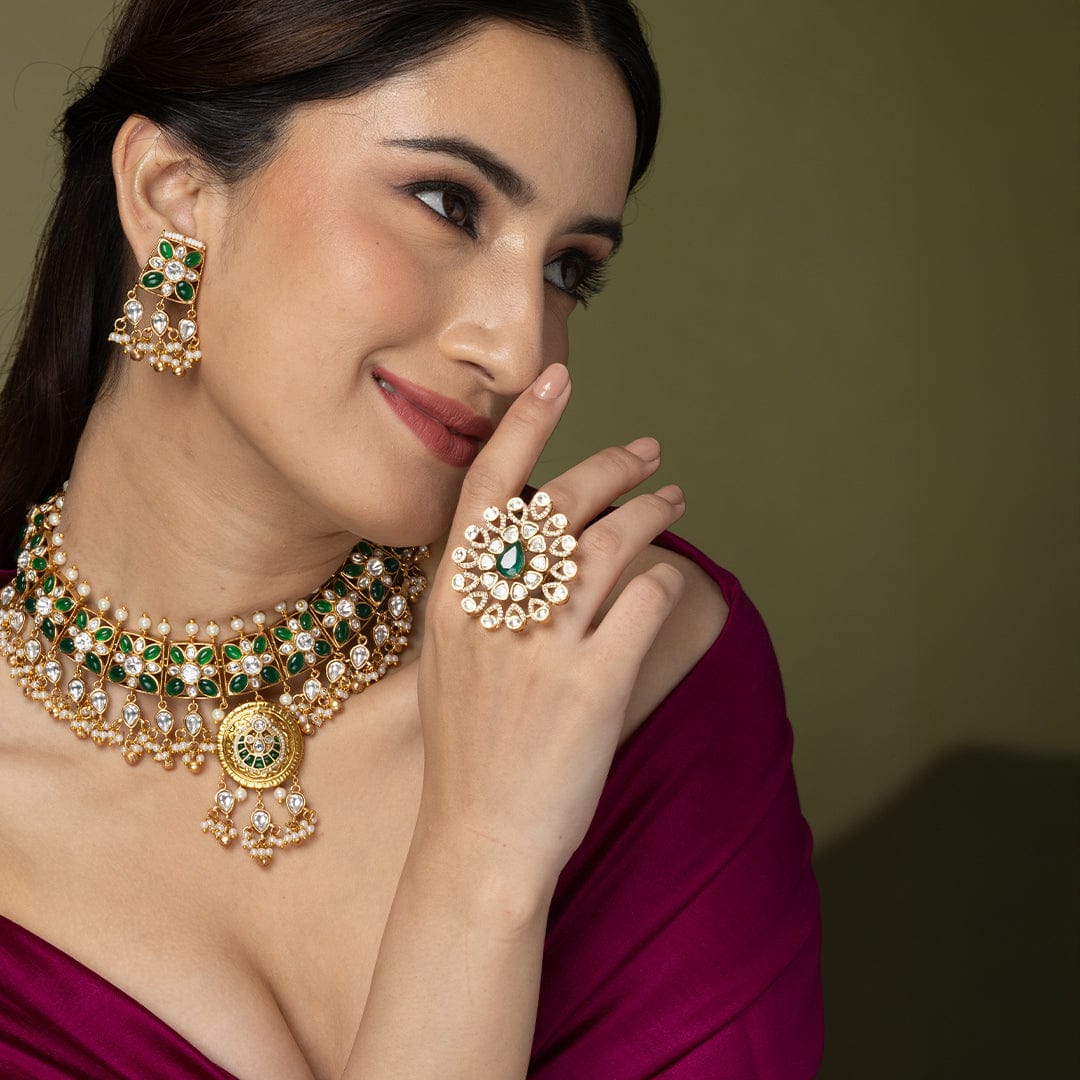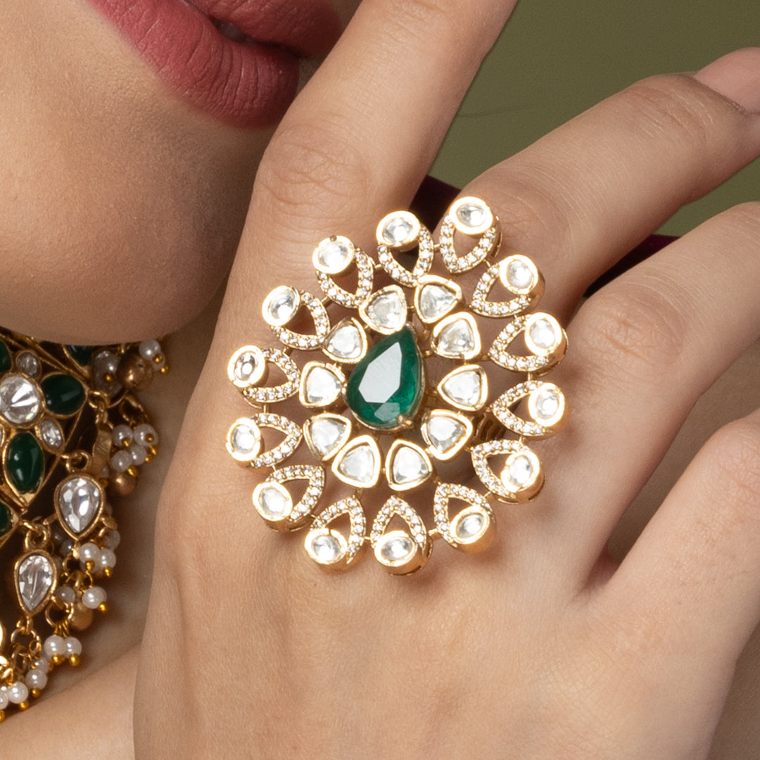 Description : This luxurious ring features a vibrant Emerald center, circled by dazzling Polki diamonds in a magnificent peacock feather design. A spectacular gold statement piece for grand occasions.