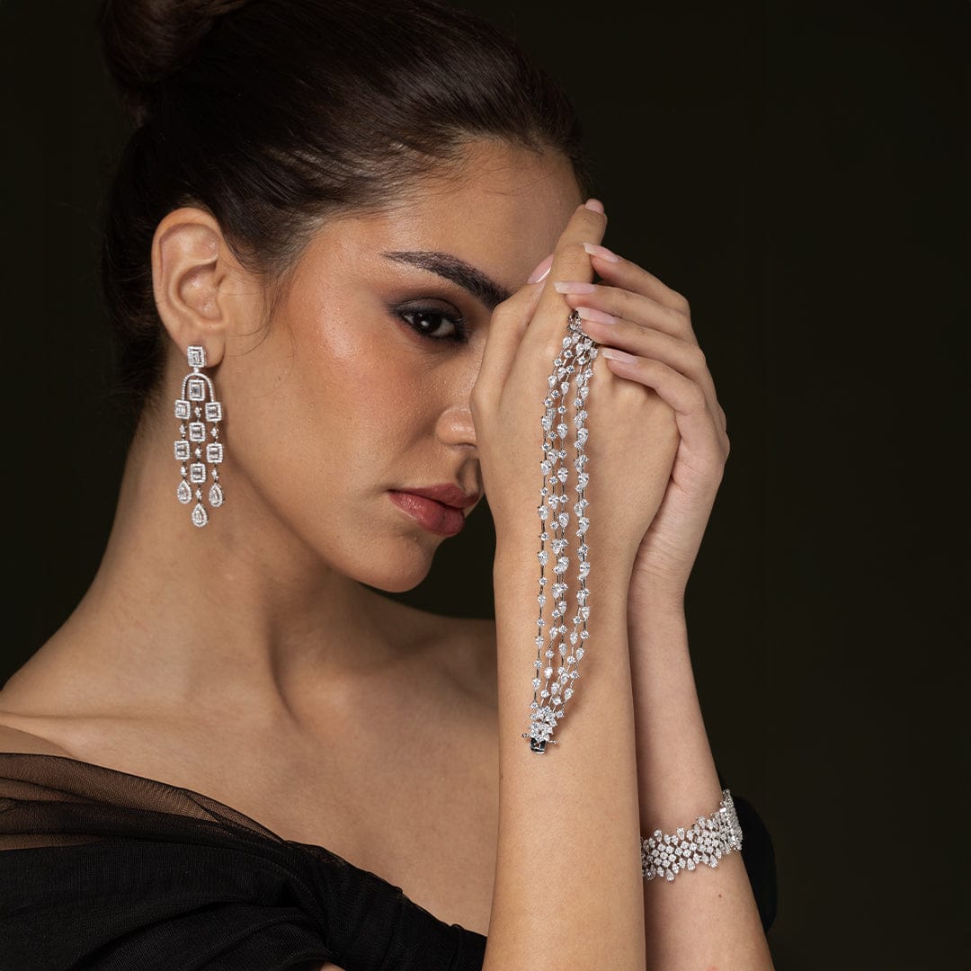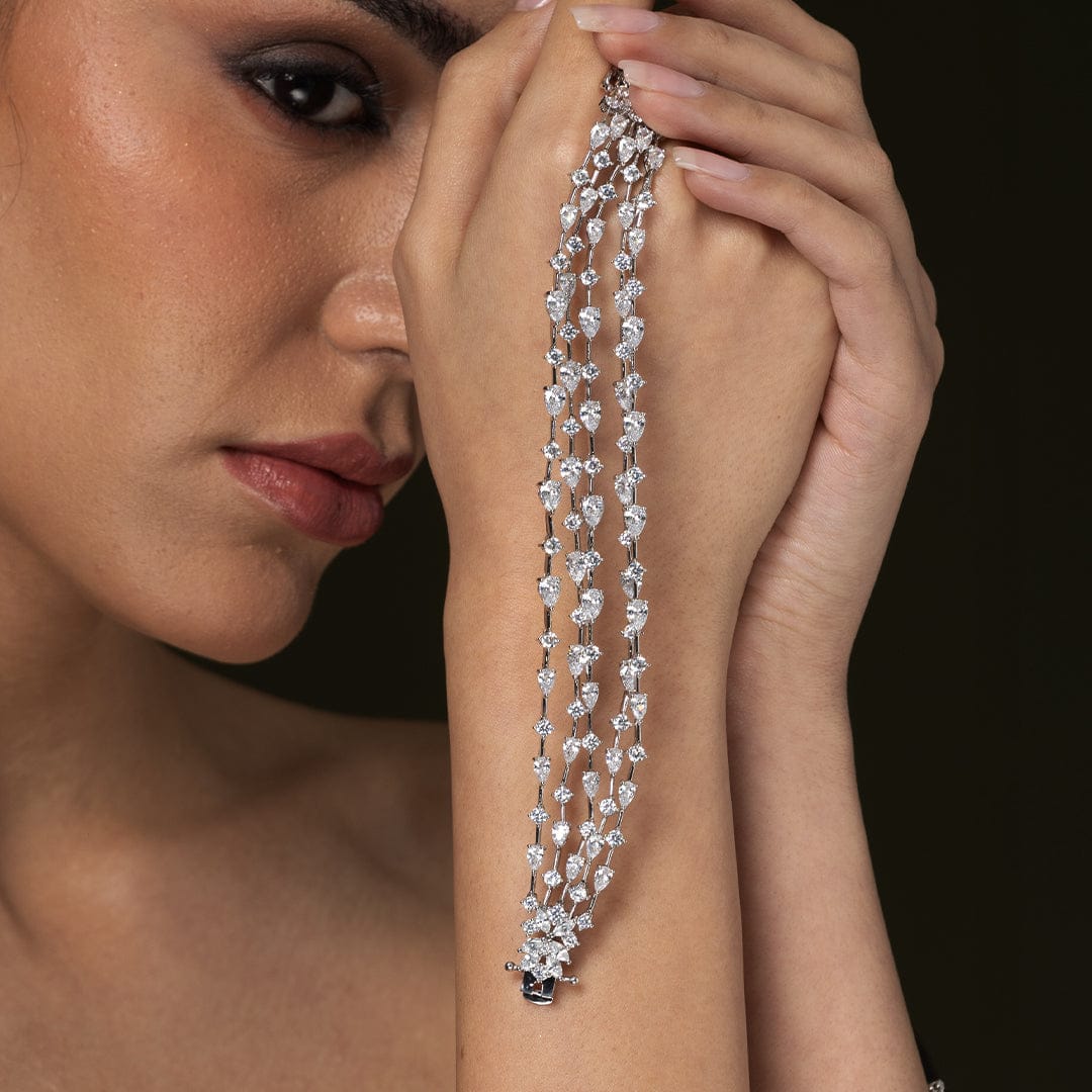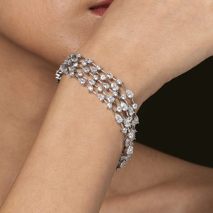 Description : Glorify your look with a single embellished loose bracelet that has delicate shimmering three rows with silver-colored stones embedded on it to display a light and airy design. For the wedding and festive season, this ornament will give a subtle sparkle, making it an excellent choice.
