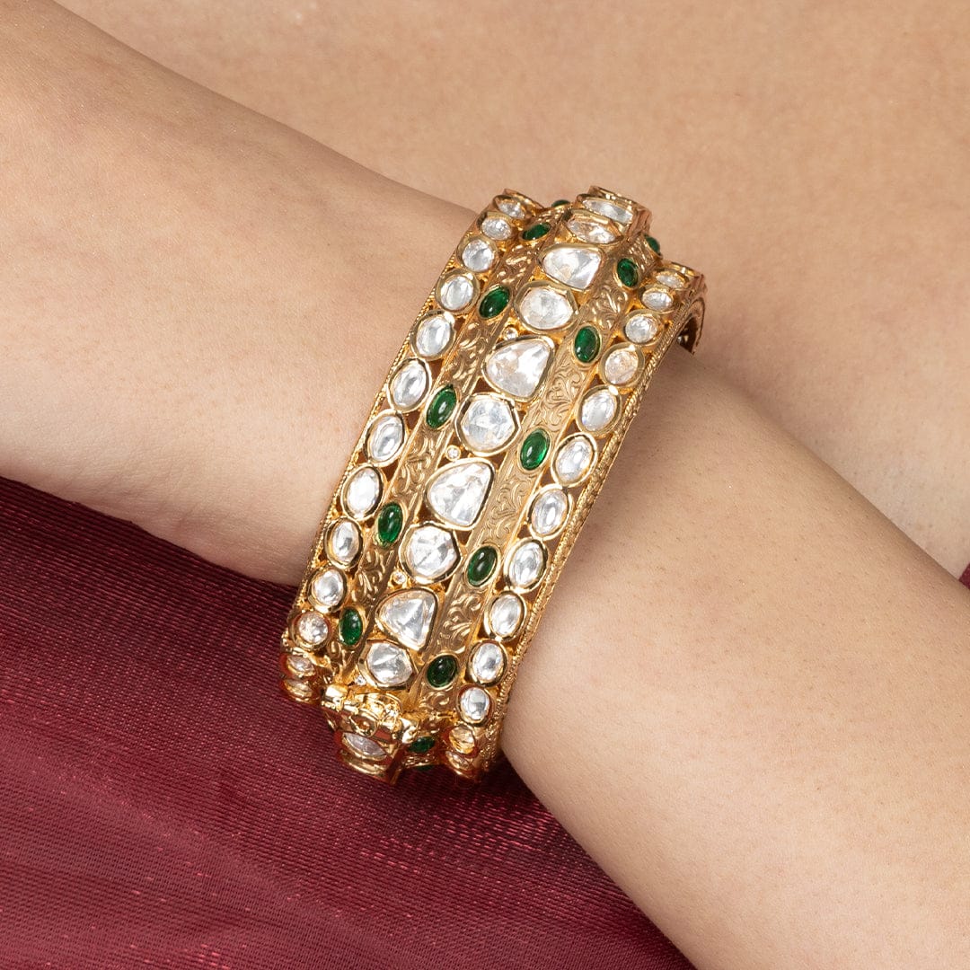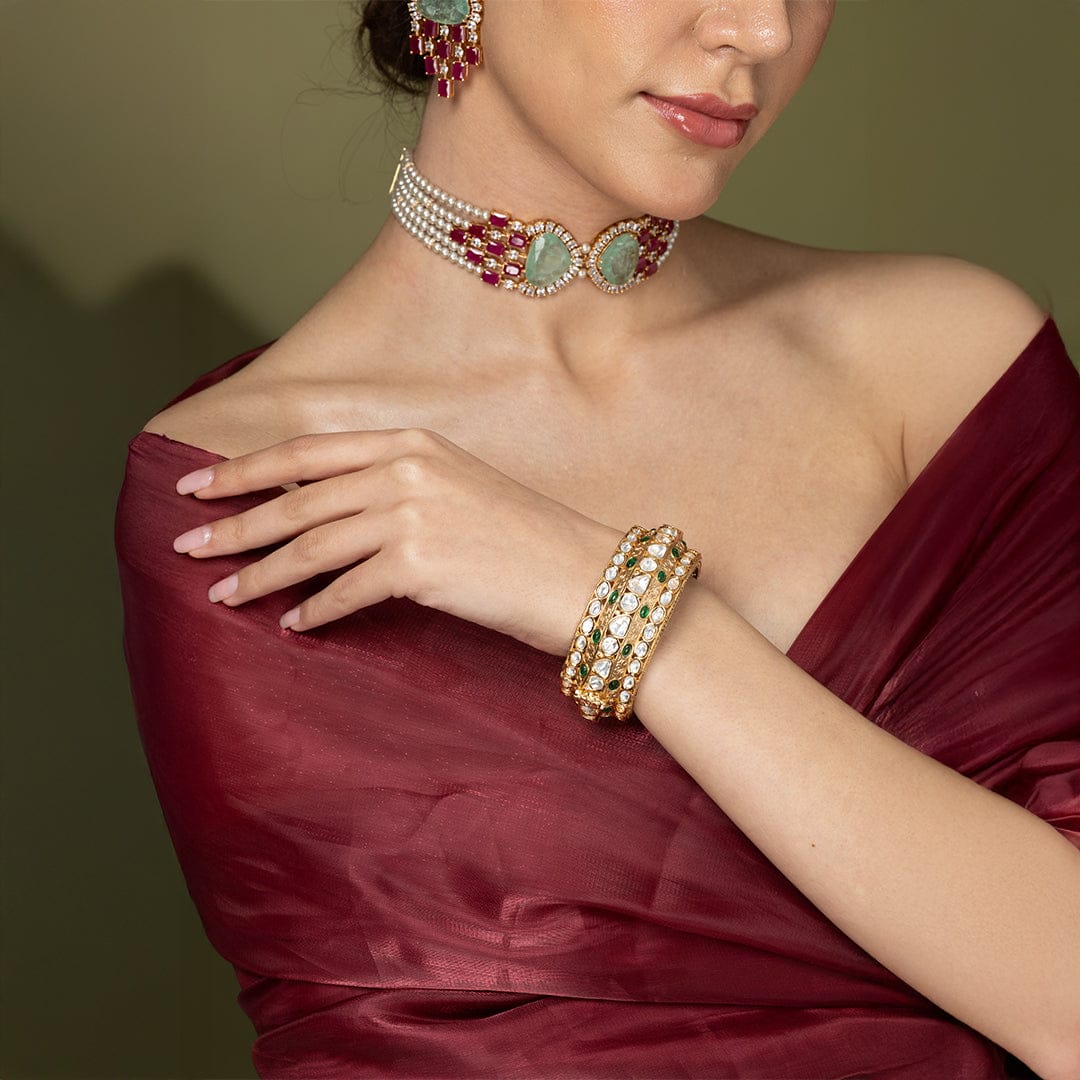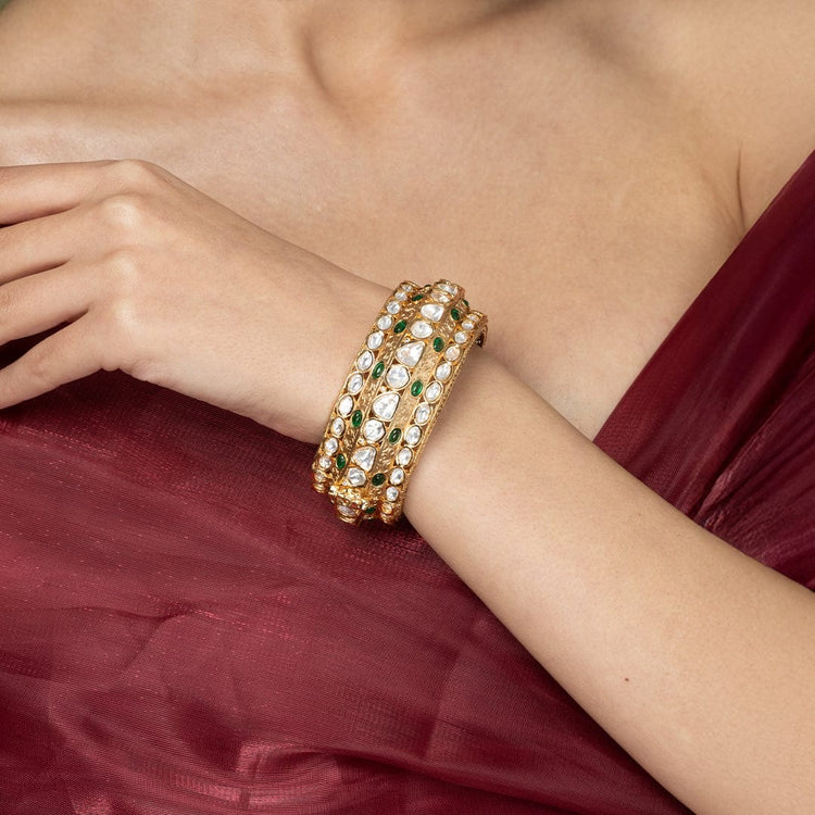 Description : Adorn your wrist with ShopJBR’s single, wide, gold-plated bangle. It has two rows of sparkling, clear stones fixed on a central row of vibrant, oval green stones. The delicacy of metalwork adds depth and elegance for you to wear on special days.