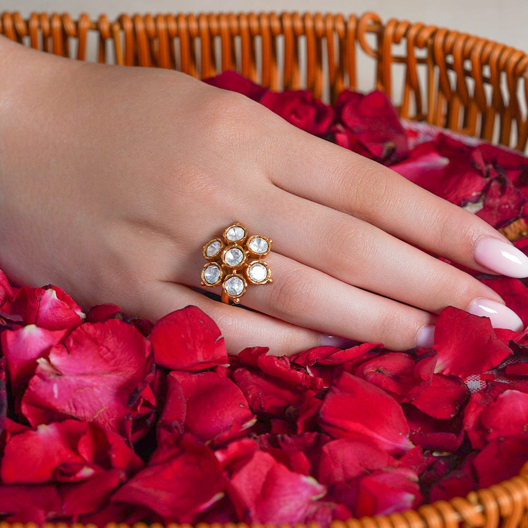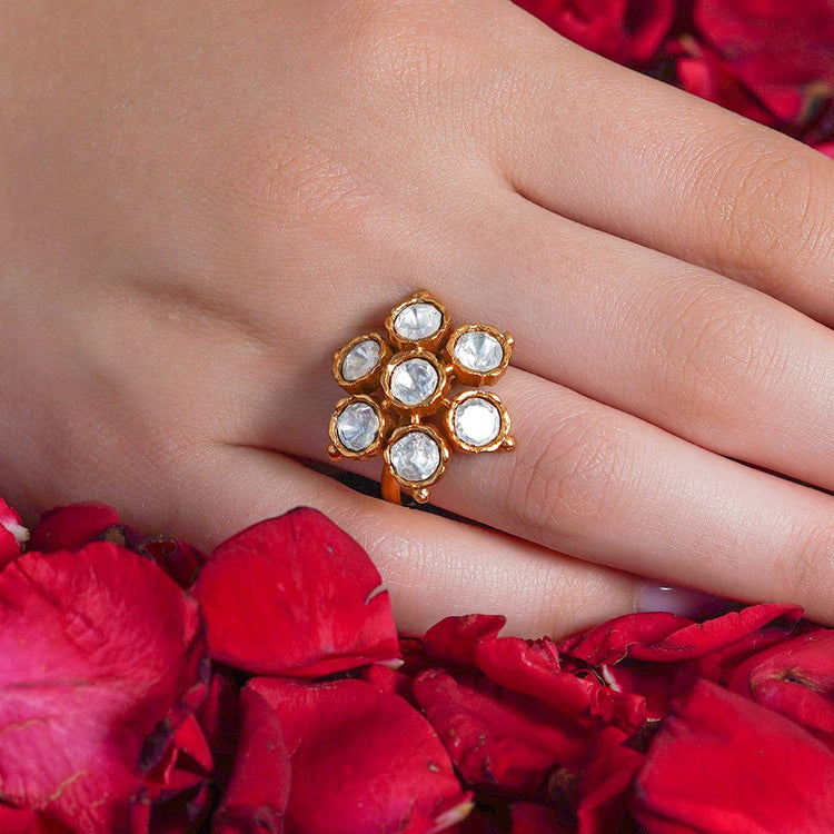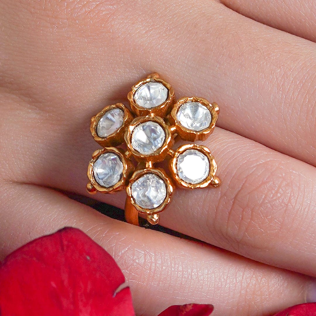 Description : The Pearla Bloom Kundan Ring features marvelous white stones in a beautiful floral design, radiating with traditional Kundan artistry.