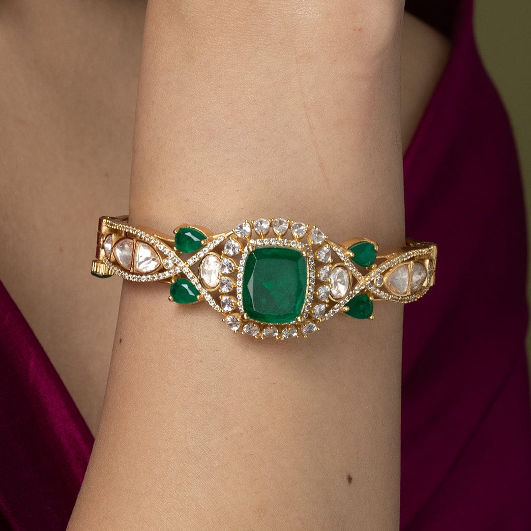 Description : This product has a pair of gold-plated bangles with an appealing design. Featuring stones like emerald-green and clear stones, along with pink accents, to give our women a rich, traditional statement look for the wedding and festive seasons.