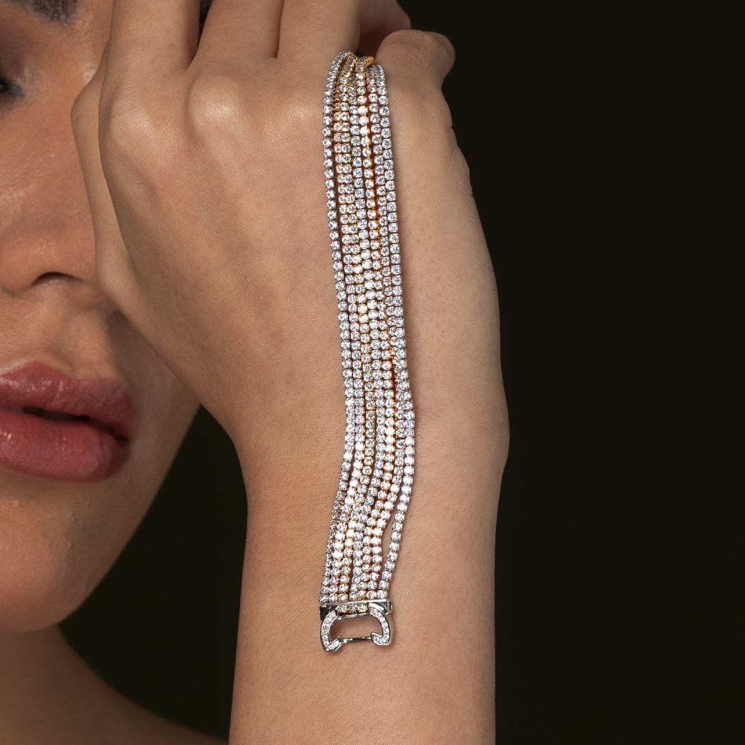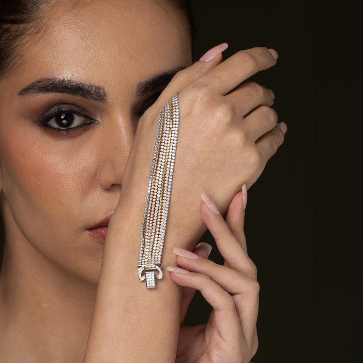 Description : An elegant, loose bracelet designed on a thin line of tiny, flashy yellow-colored stones with a delicate silver-toned setting. Flaunt elegance every day with our yellow-stone tennis bracelet..