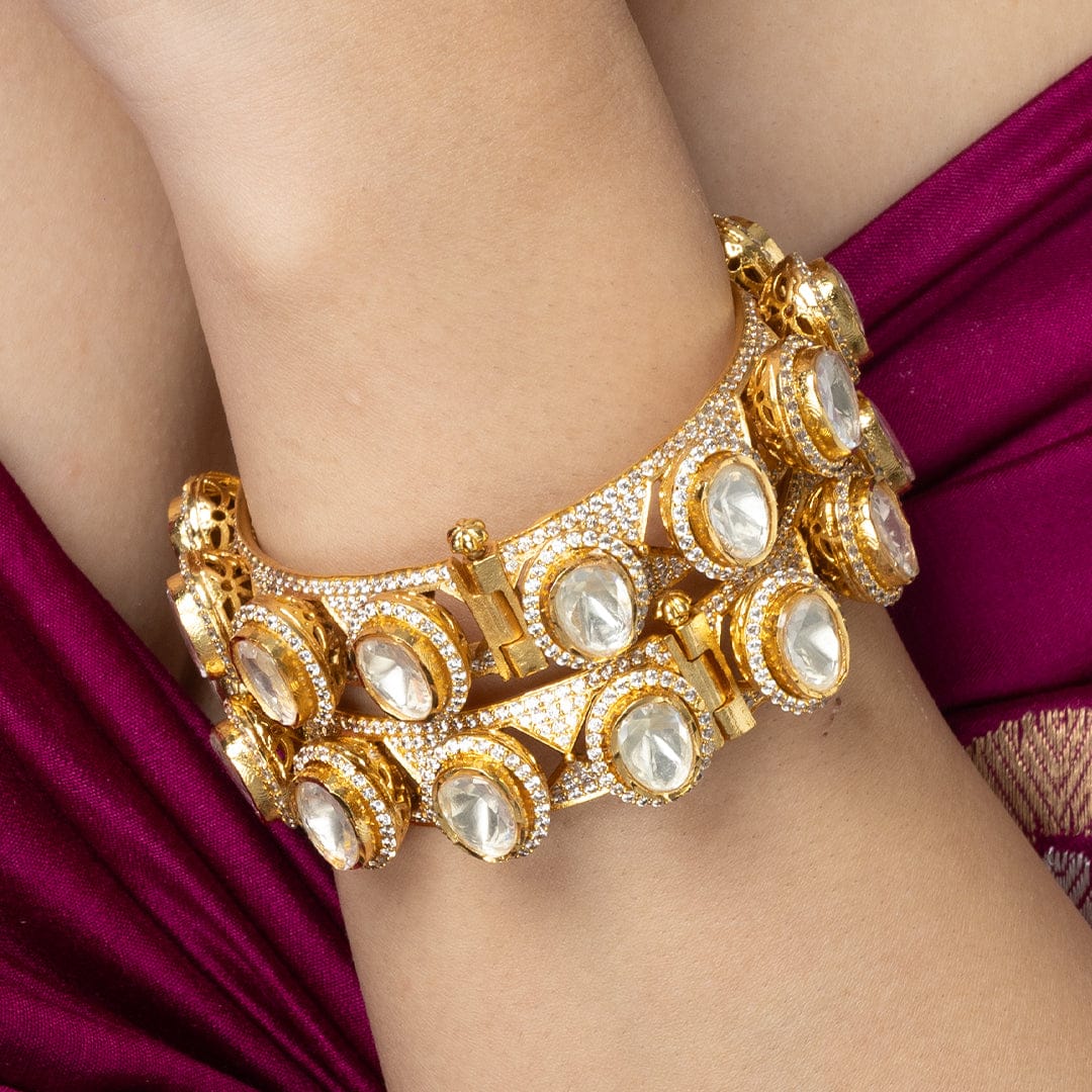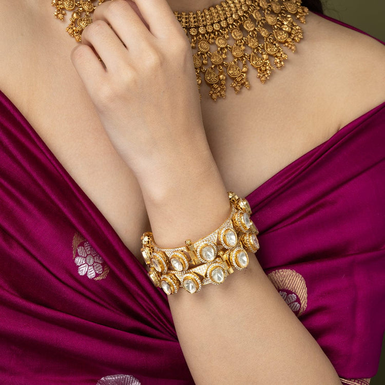 Description : The Traditional Kundan-Style Gold-Plated Bangle comes in a pair with a traditional design. Each bangle is moderately heavy with clear, rounded stones with contrasting dark accents to flaunt a regal look. Perfect to gift on wedding days or the festive season.