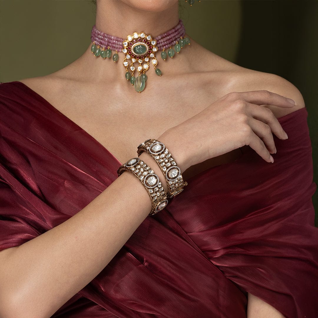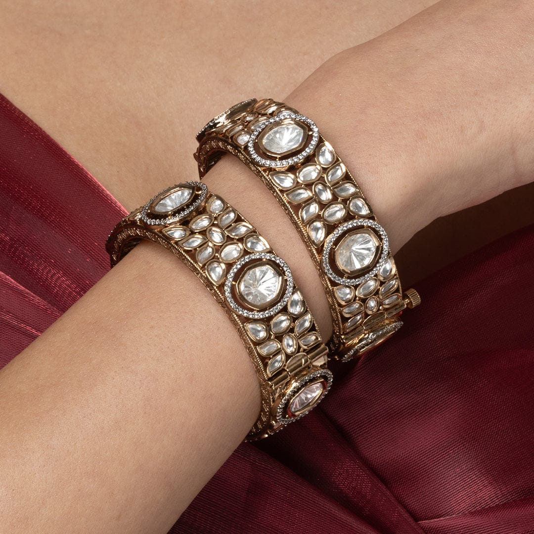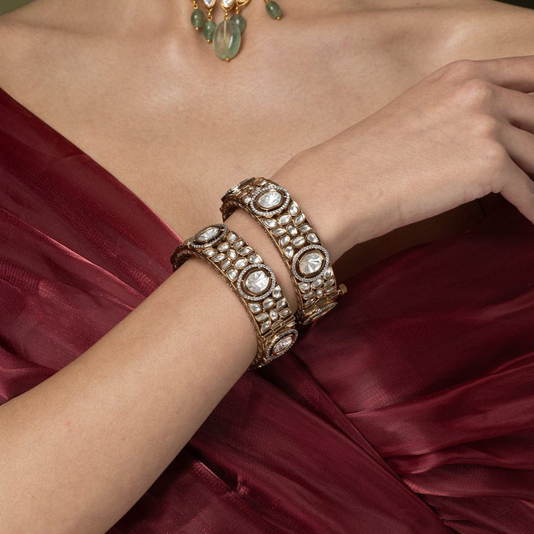 Description : This set includes a pair of bangles with a rich, traditional setting. They feature large, uncut, clear stones with intricate gold detailing, perfect for a heavy, classic look.