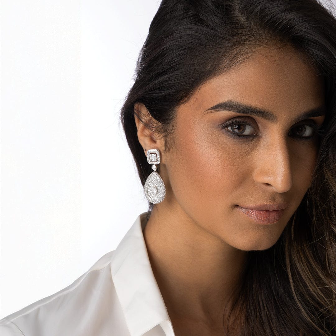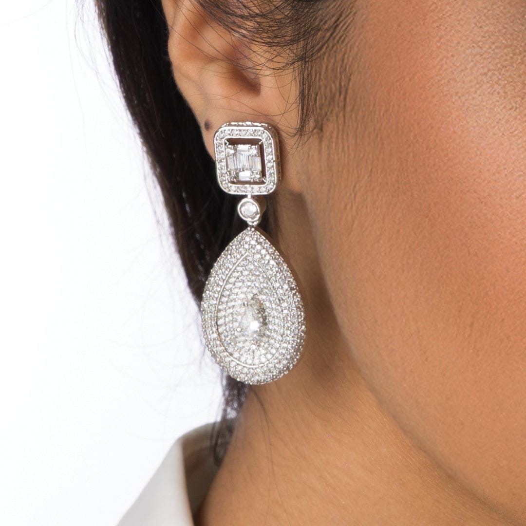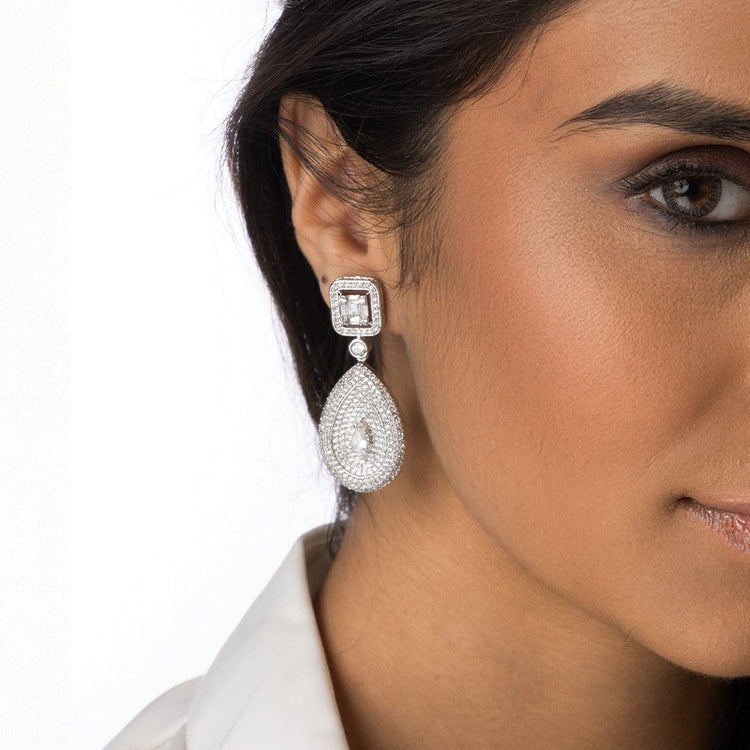 Description: These statement online Indian jewellery earrings feature a square stud leading to a dramatic pear-shaped drop. Adorned with brilliant stones, this stunning pair is elegantly finished with high-quality silver plating.