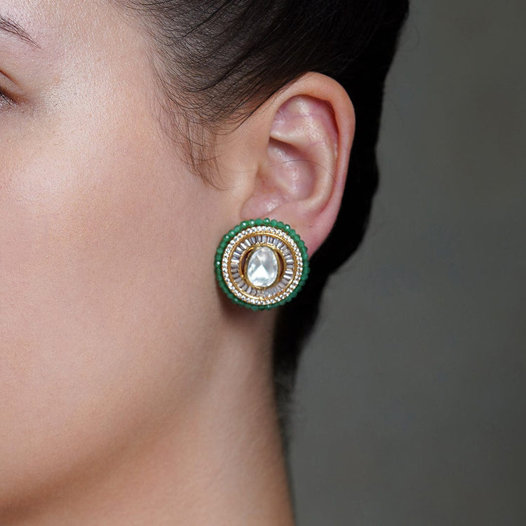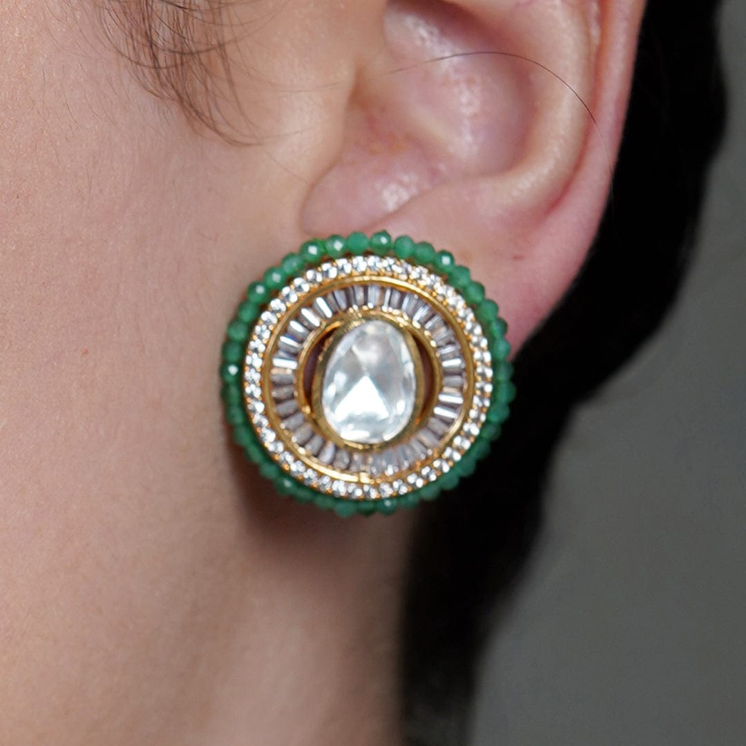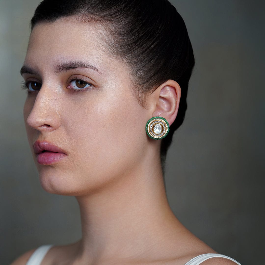 Description: ShopJBR’s premium Emerald Halo Polki Stud Earrings add a royal touch to your attire. Our Polki Stud Earrings are designed to bring elegance and sparkle to your festive ensemble.