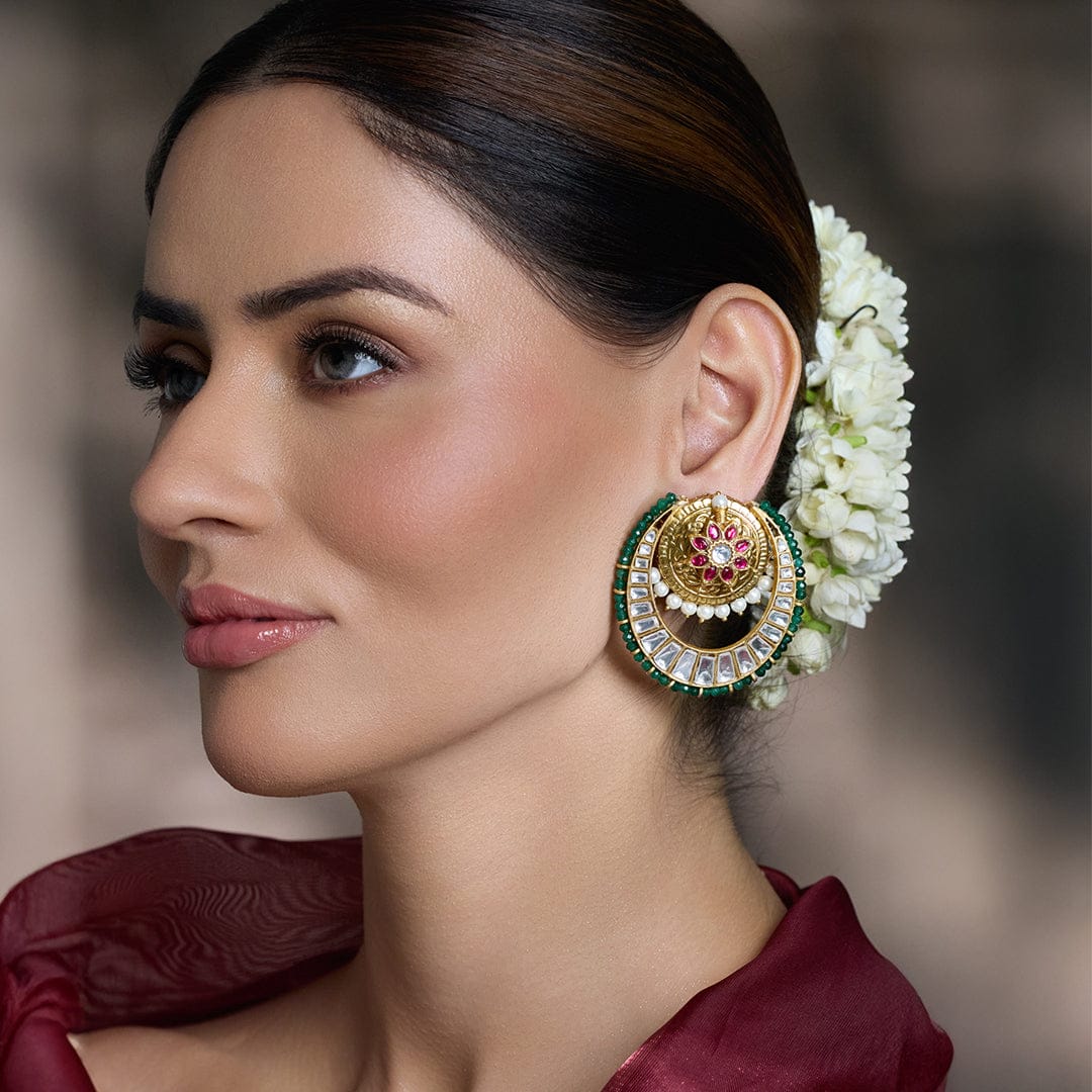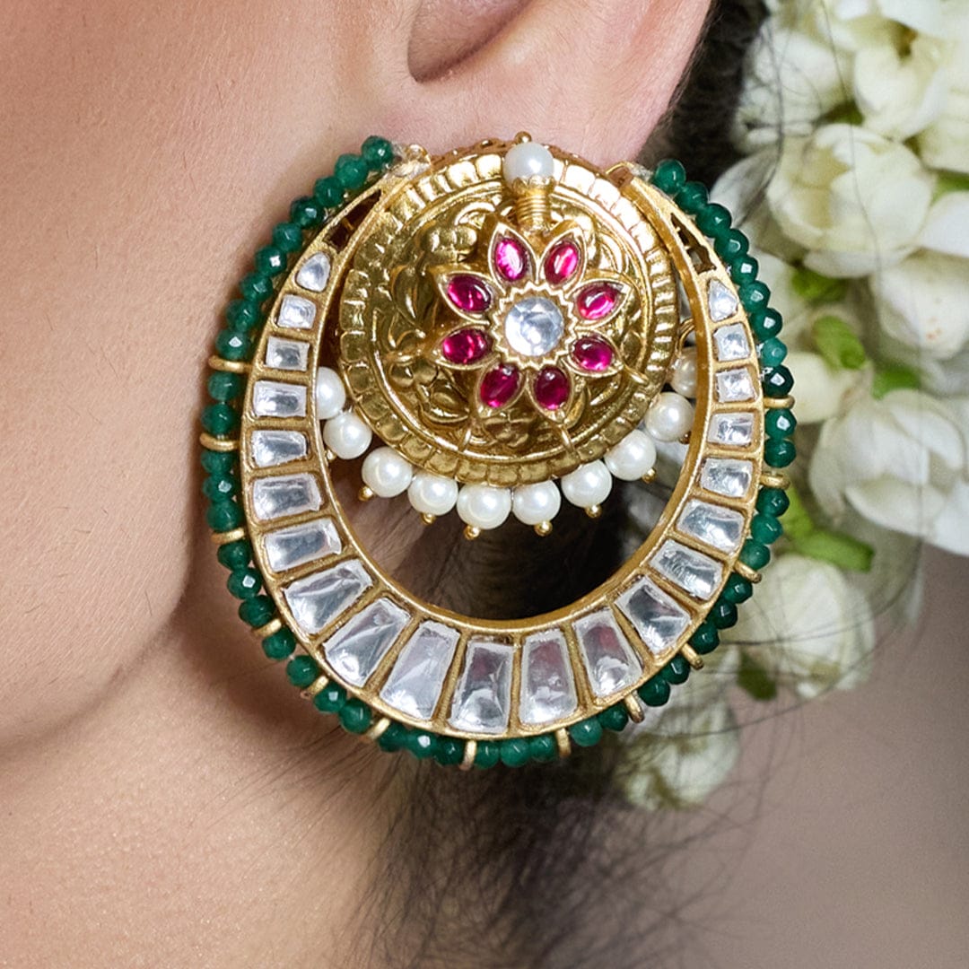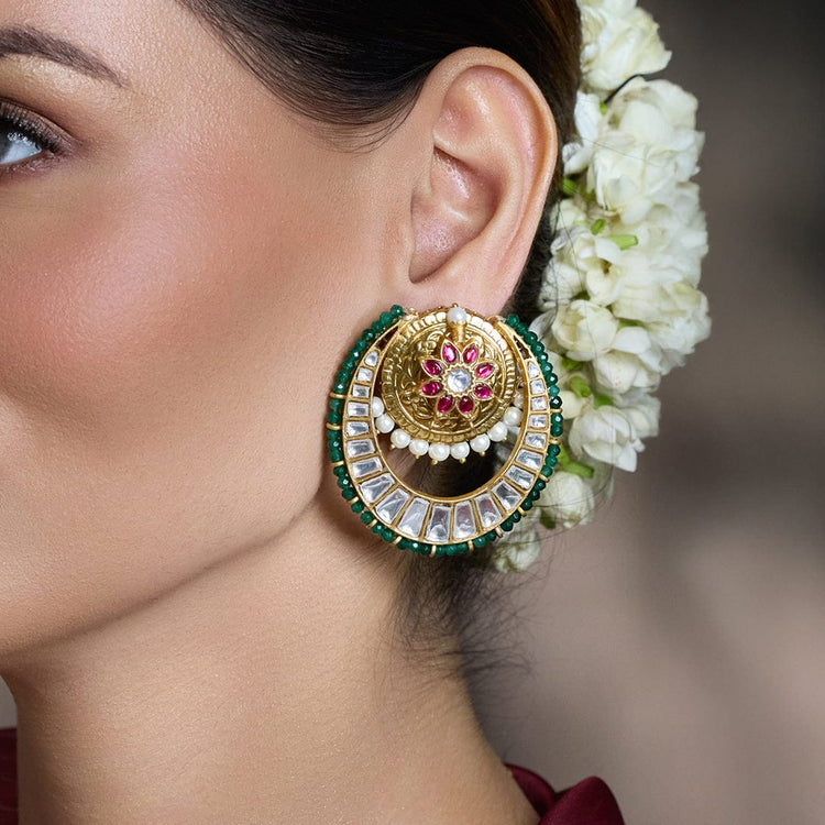 Description: Majestic Bloom Chandbali Earrings featuring vibrant stones, pearl accents, and antique gold finish. Perfect for weddings, festivals, and traditional outfits.