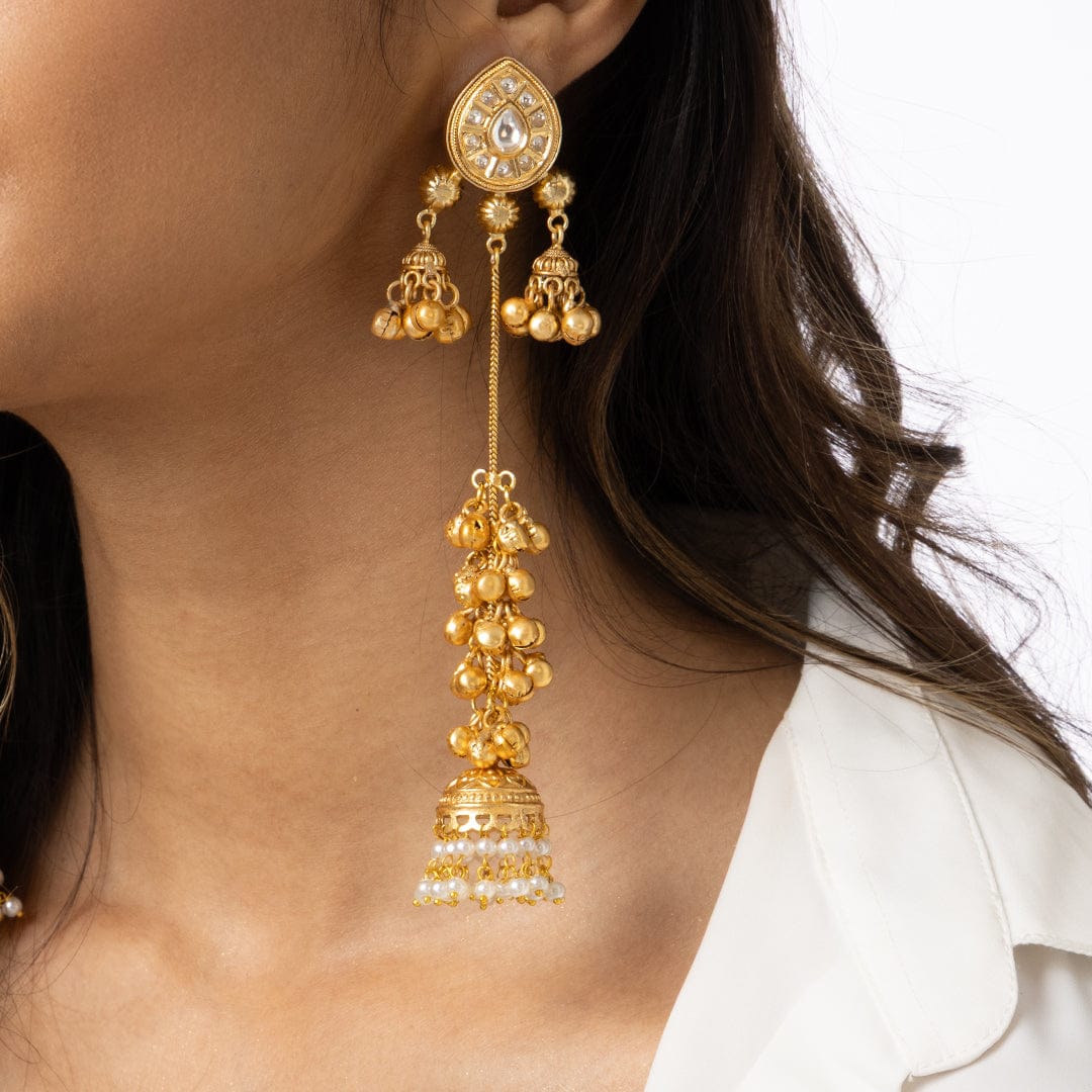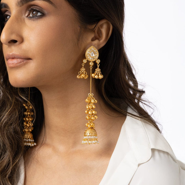 Description: Exclusive gold-finish jhumka with layered bead detailing, offering a graceful traditional look perfect for weddings, celebrations, and stylish ethnic fashion lovers.