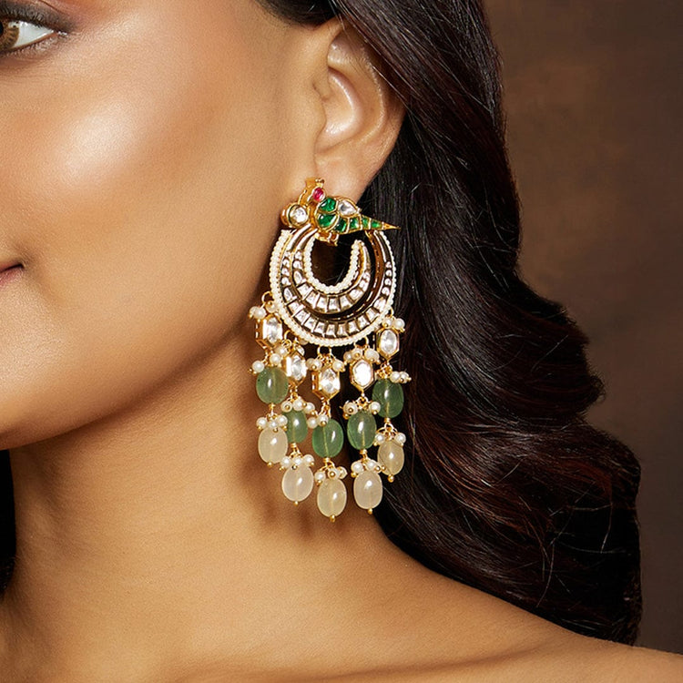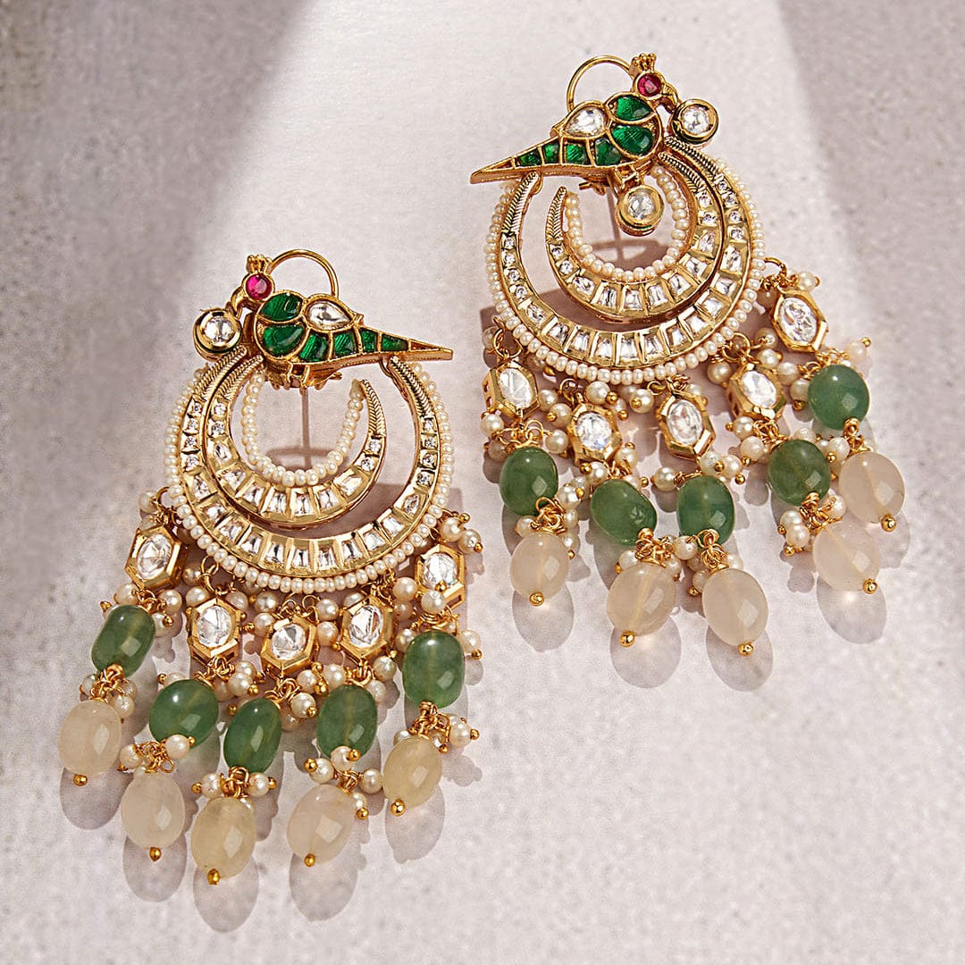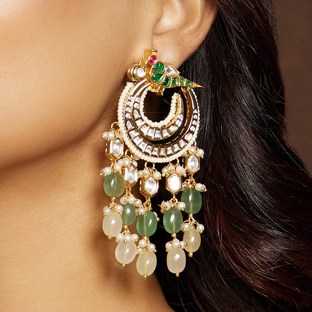 Description :Drape in opulence with our Bespoke Multi Colour Earring, a dazzling kundan polki chandelier masterpiece. Its bird-shaped motif, adorned with hydro ruby, emerald, pearls, jade beads, and agates, makes a luxurious statement. Ideal for elevating your style at festive, wedding, and party occasions, perfectly complementing Indian & fusion attire. Immerse yourself in regality with every detail, meticulously crafted using real semi-precious stones.