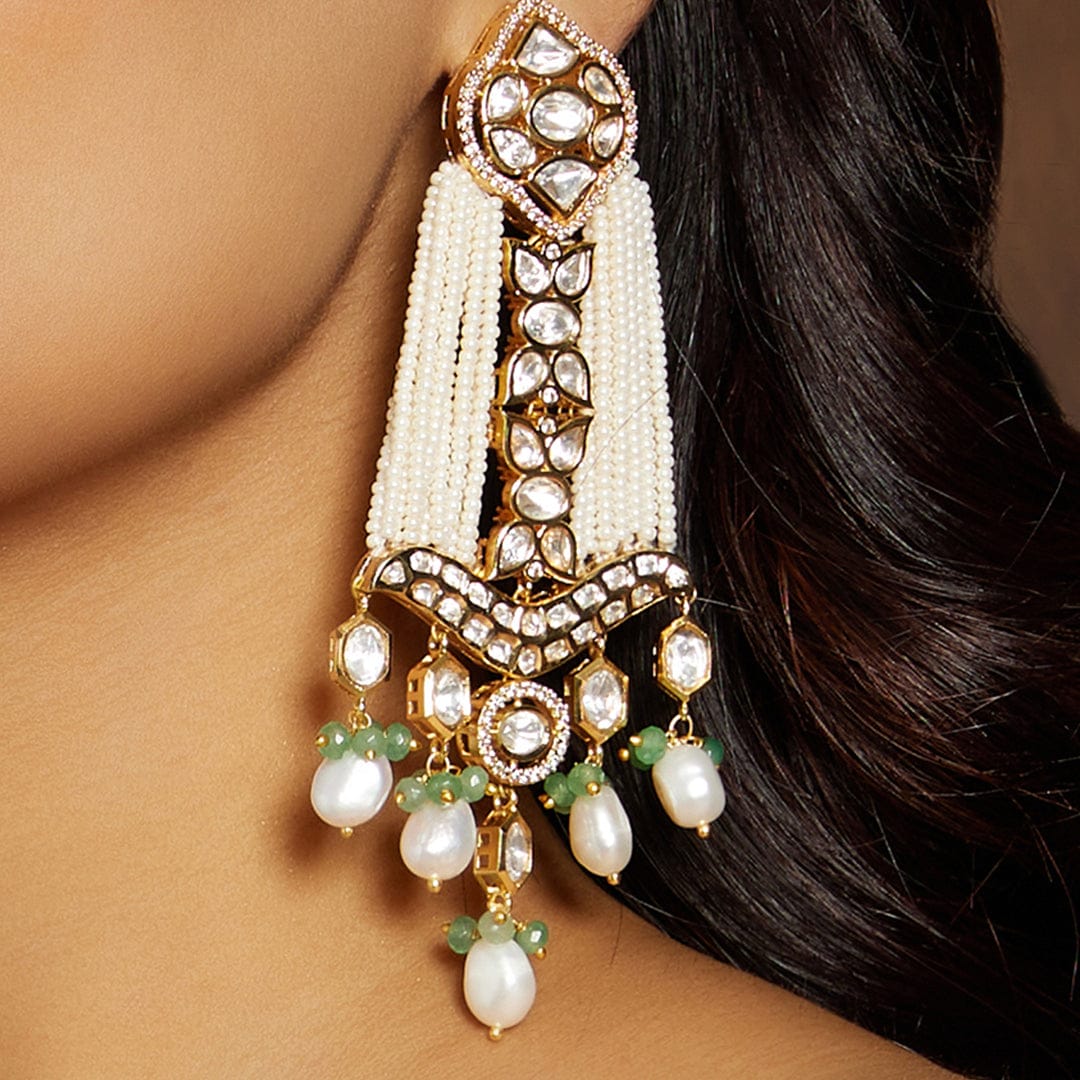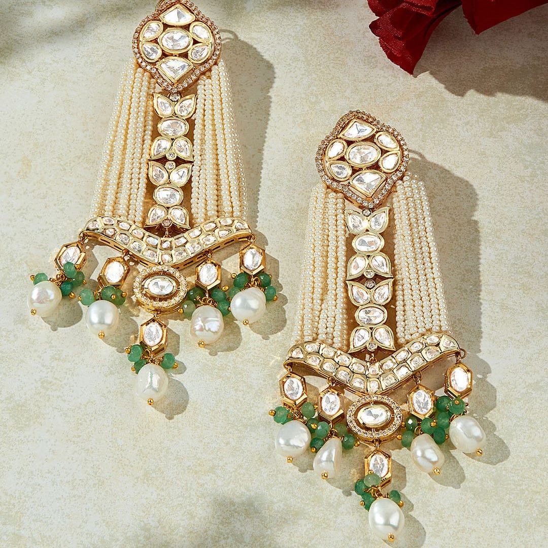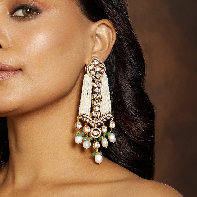Description :Bespoke White & Golden Chandelier Earring: Handcrafted elegance with fancy polkis, pearl beads, and green beads. Perfect for festive, wedding, and party occasions, enhancing Indian & fusion attire. Joules by Radhika ensures a regal touch with real semi-precious stones.