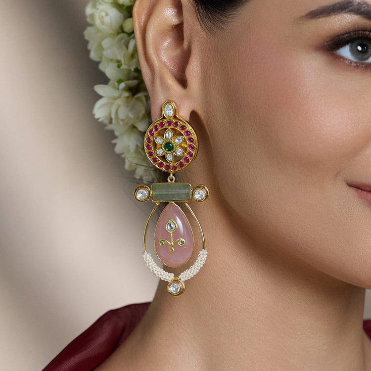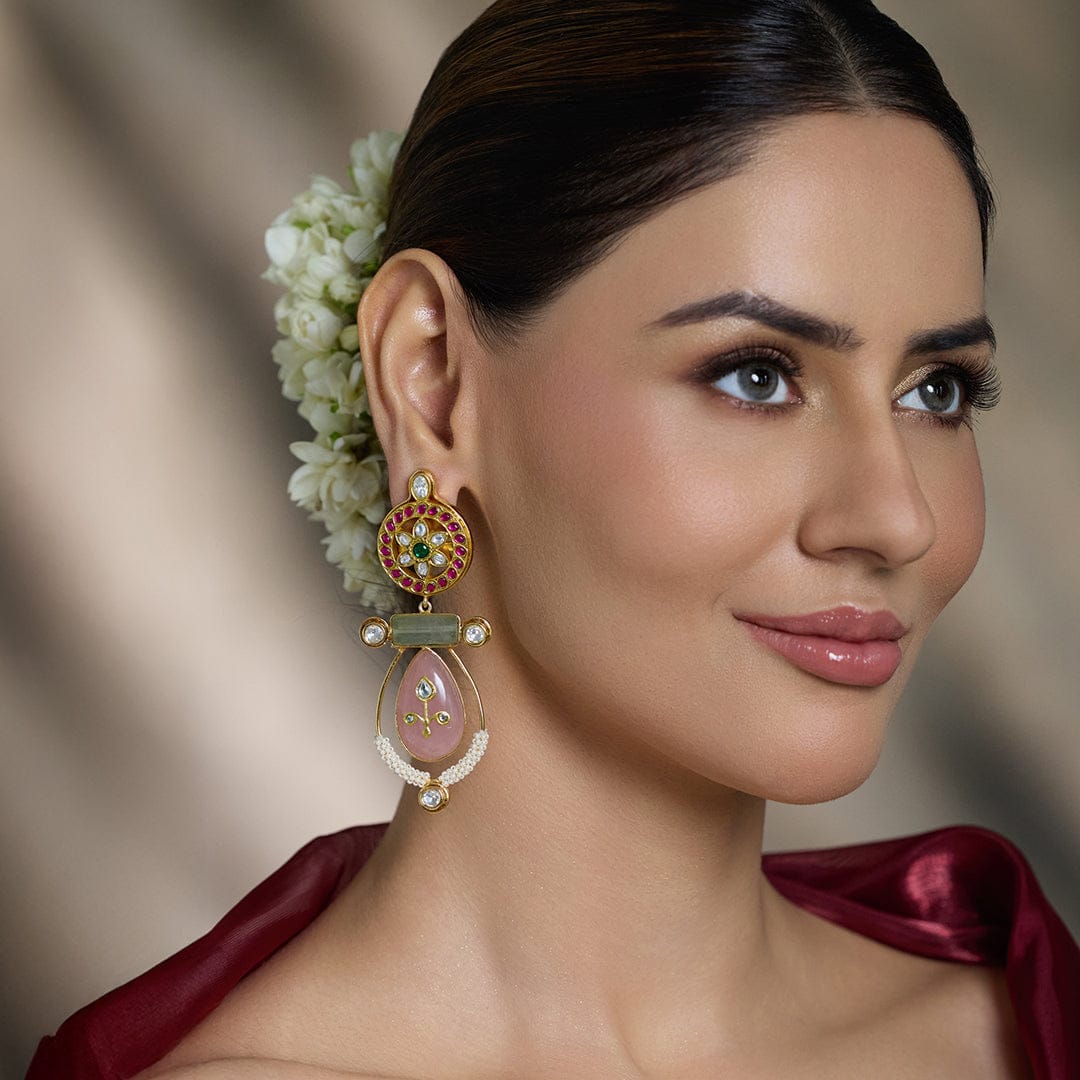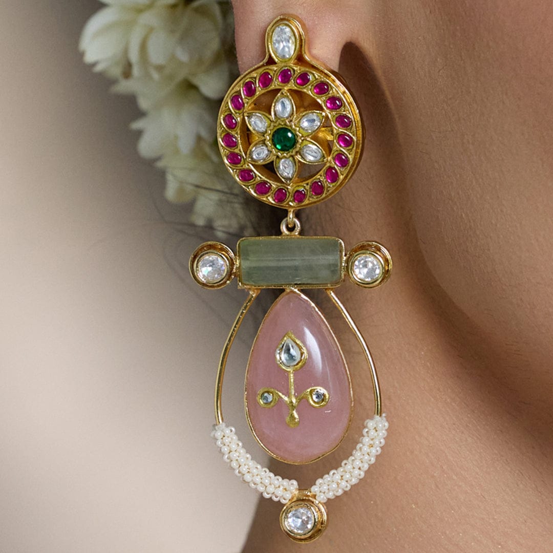 Description: Exude elegance with these graceful pink and green kundan earrings, featuring teardrop stones, pearl accents, and intricate craftsmanship. Perfect for pastel-themed outfits, festive occasions, or elegant traditional gatherings.