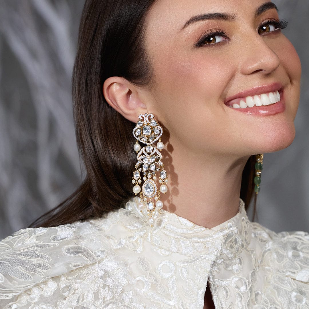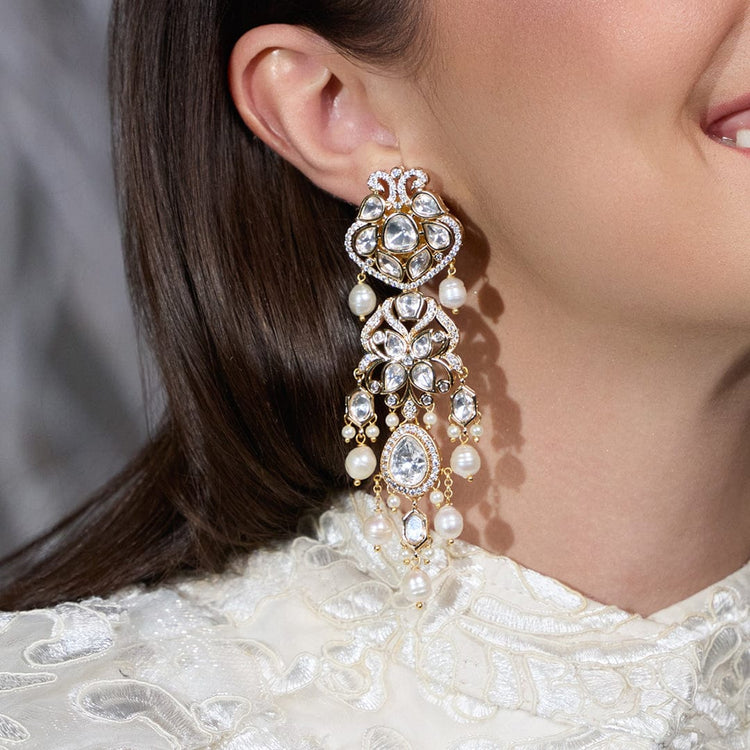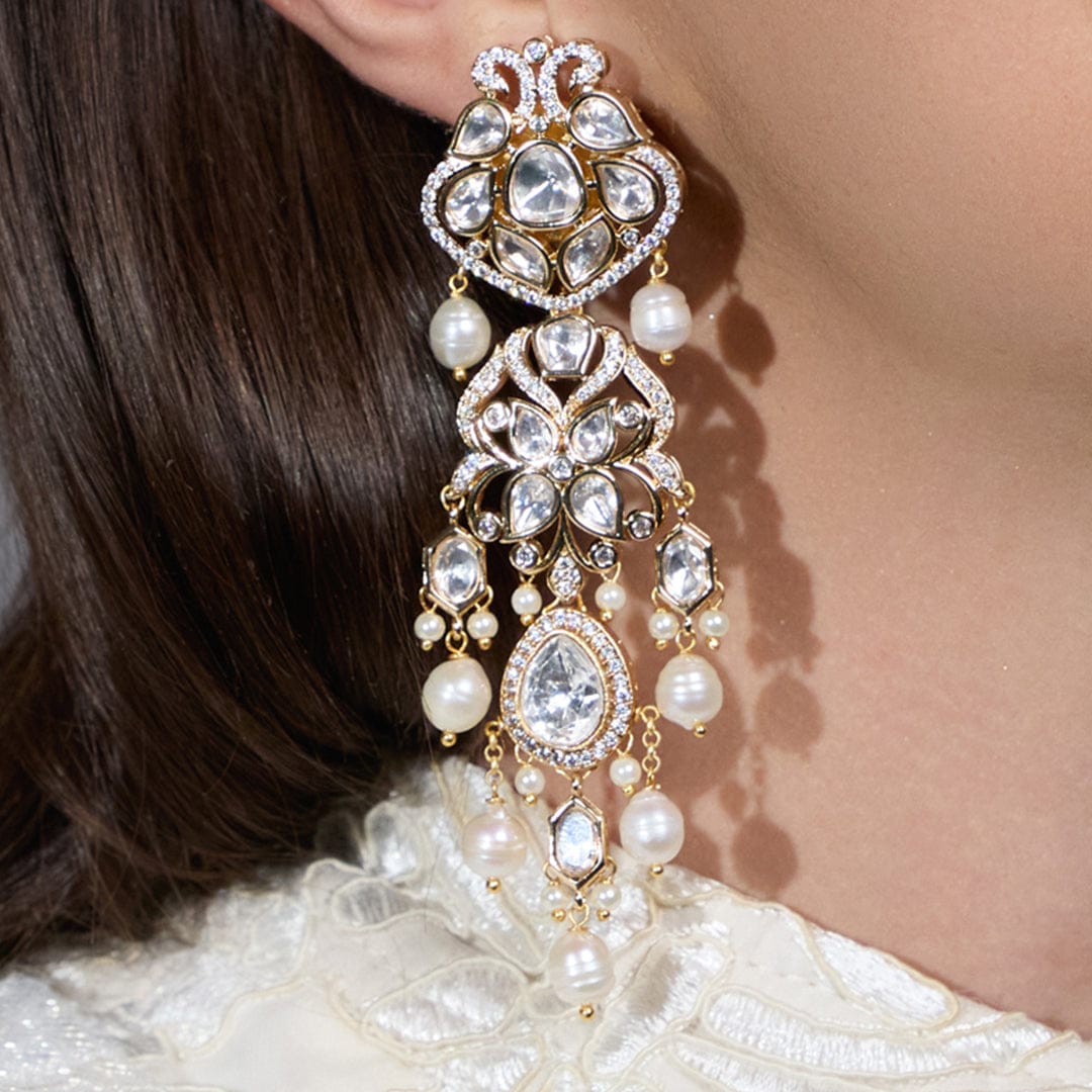 Description: These elegant earrings sparkle with sets of crystals and intricate gold-toned detailing, cascading into a delicate drop design. Ideal for evening wear, bridal glam, or festive sophistication.
