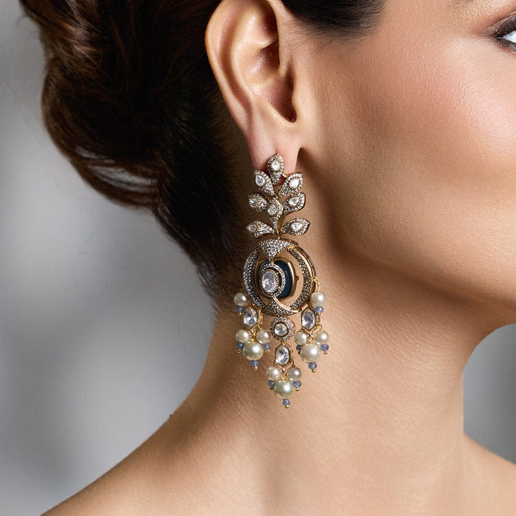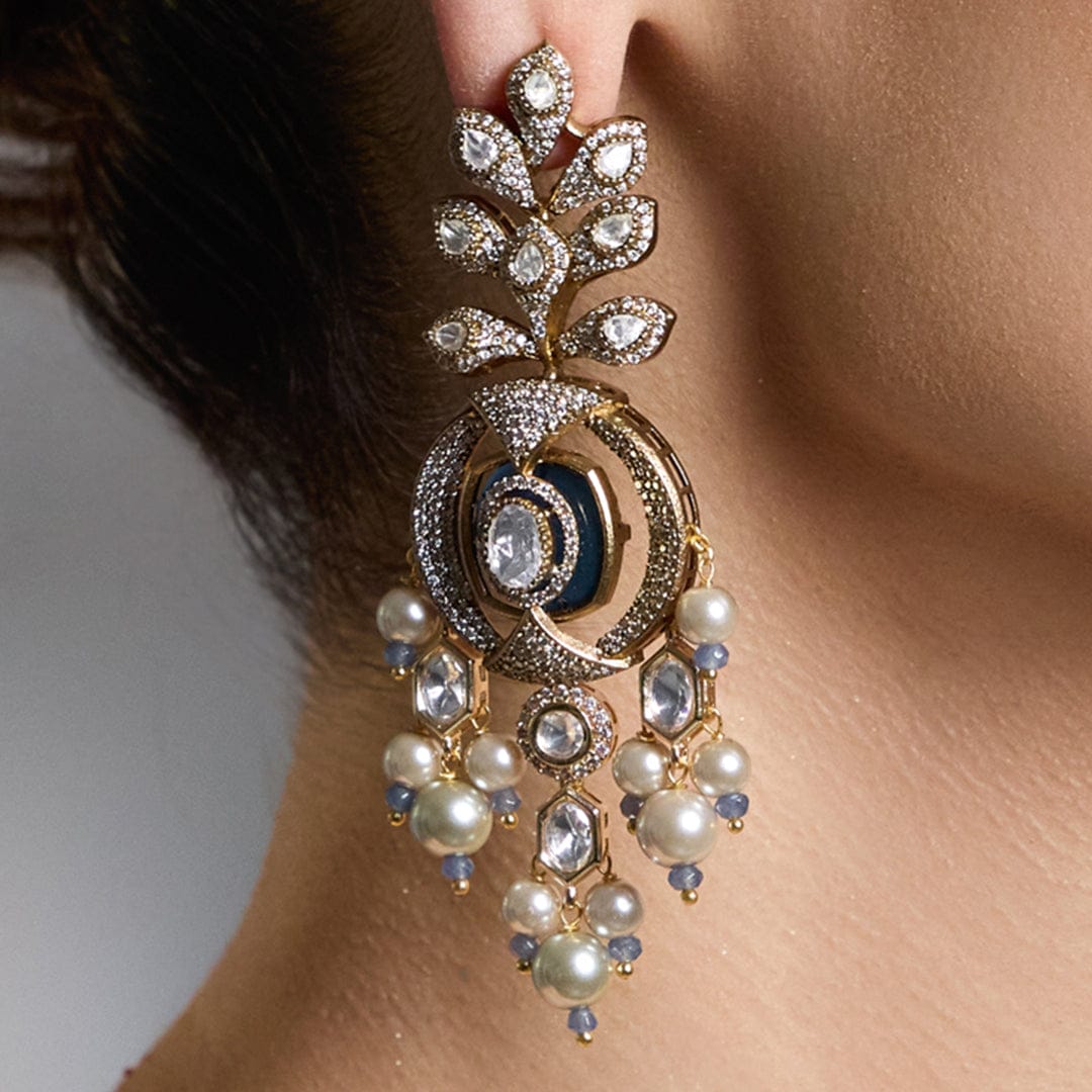 Description: Make a bold statement with these regal black and gold kundan earrings, featuring intricate detailing and elegant pearl danglers. Perfect for weddings, festive celebrations, and graceful traditional attire.