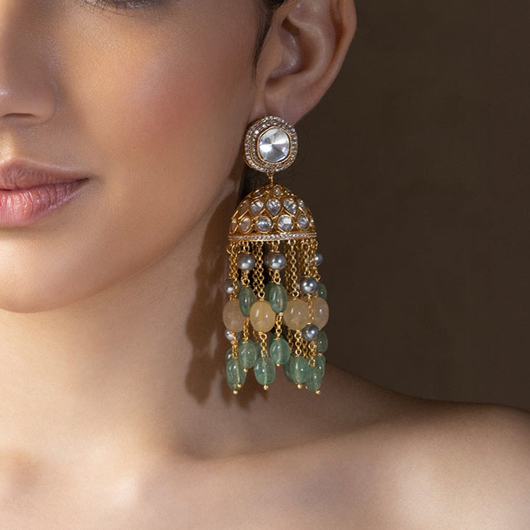 Description: Embrace vibrant elegance with Multi Colour Polki Jhumka Earrings. 22Kt Gold Plated, featuring hydro polkis and multi-colour semi stones, these earrings are perfect for weddings, parties, festivals, or personal milestones.