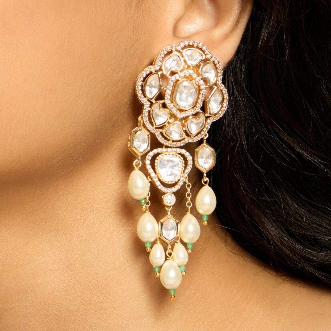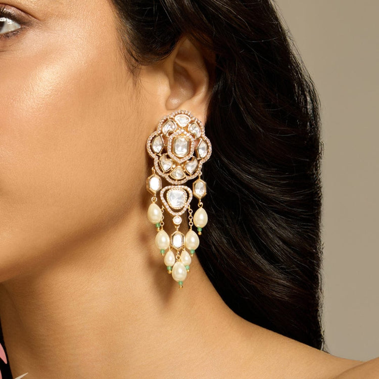 Description: Pearl Essence Dangles feature a sleek and minimalist design, showcasing the understated beauty of polki stones paired with lustrous pearls. These delicate earrings offer a refined touch, making them perfect for both casual outings and sophisticated events. Their lightweight construction ensures comfort, while the subtle shimmer adds a hint of glamour, making these dangles an essential accessory for the modern, style-conscious individual.
