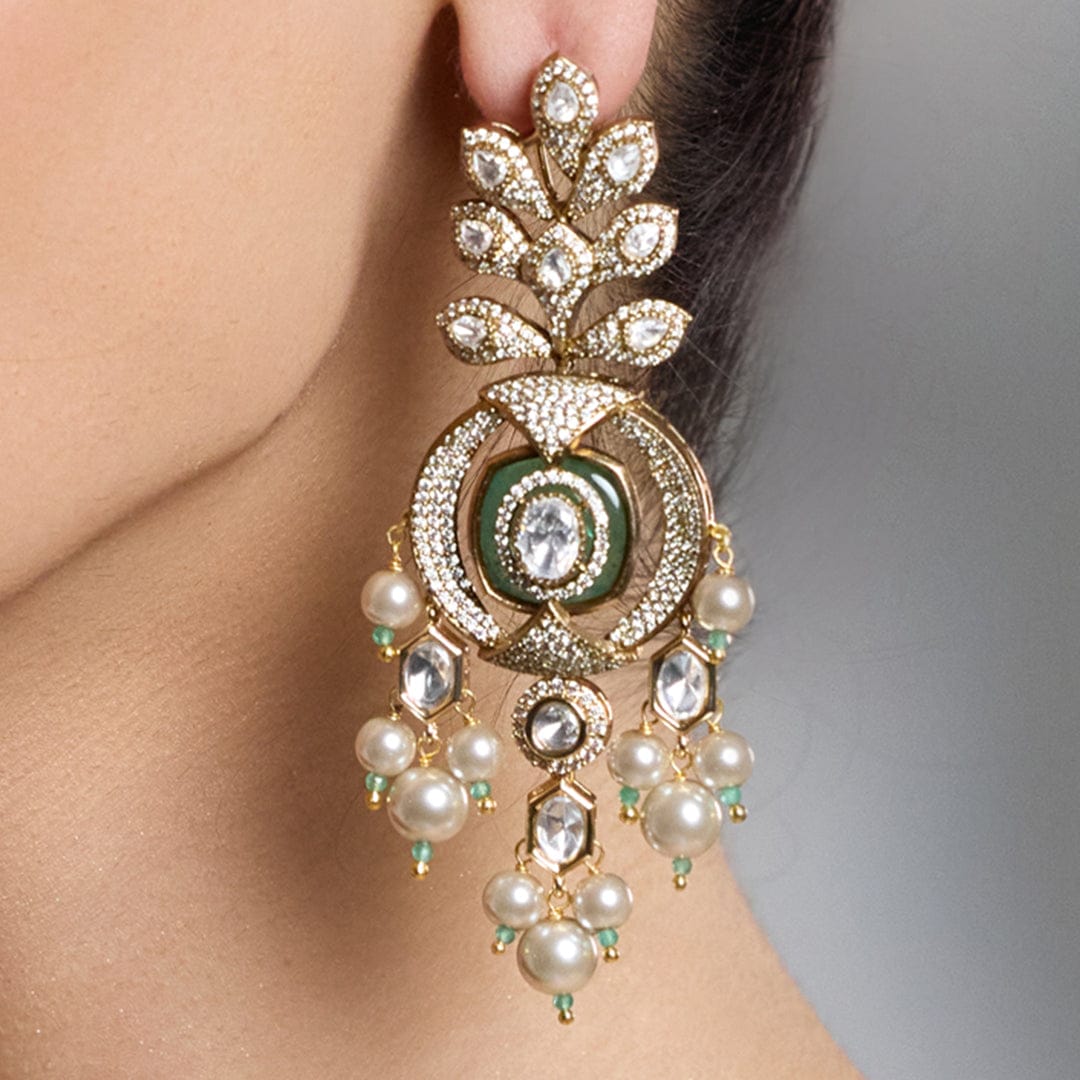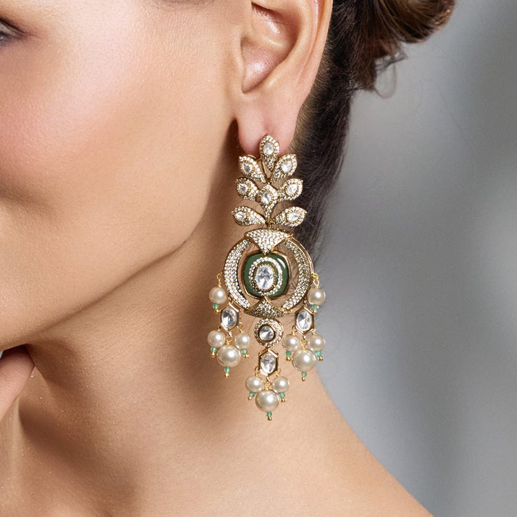 Description: Add royal charm to your look with Pearl Cascade Polki Earrings featuring intricate detailing, uncut stones, and delicate pearl drops for a perfect blend of tradition and elegance.