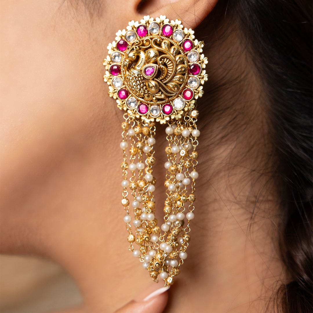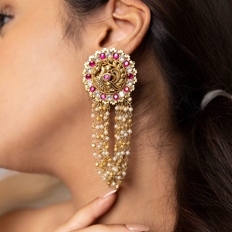 Description: A dramatic pair of gold-finish chandbaalis encrusted with pink stones and cascading pearl tassels. Ideal for bridal looks and regal traditional ensembles.