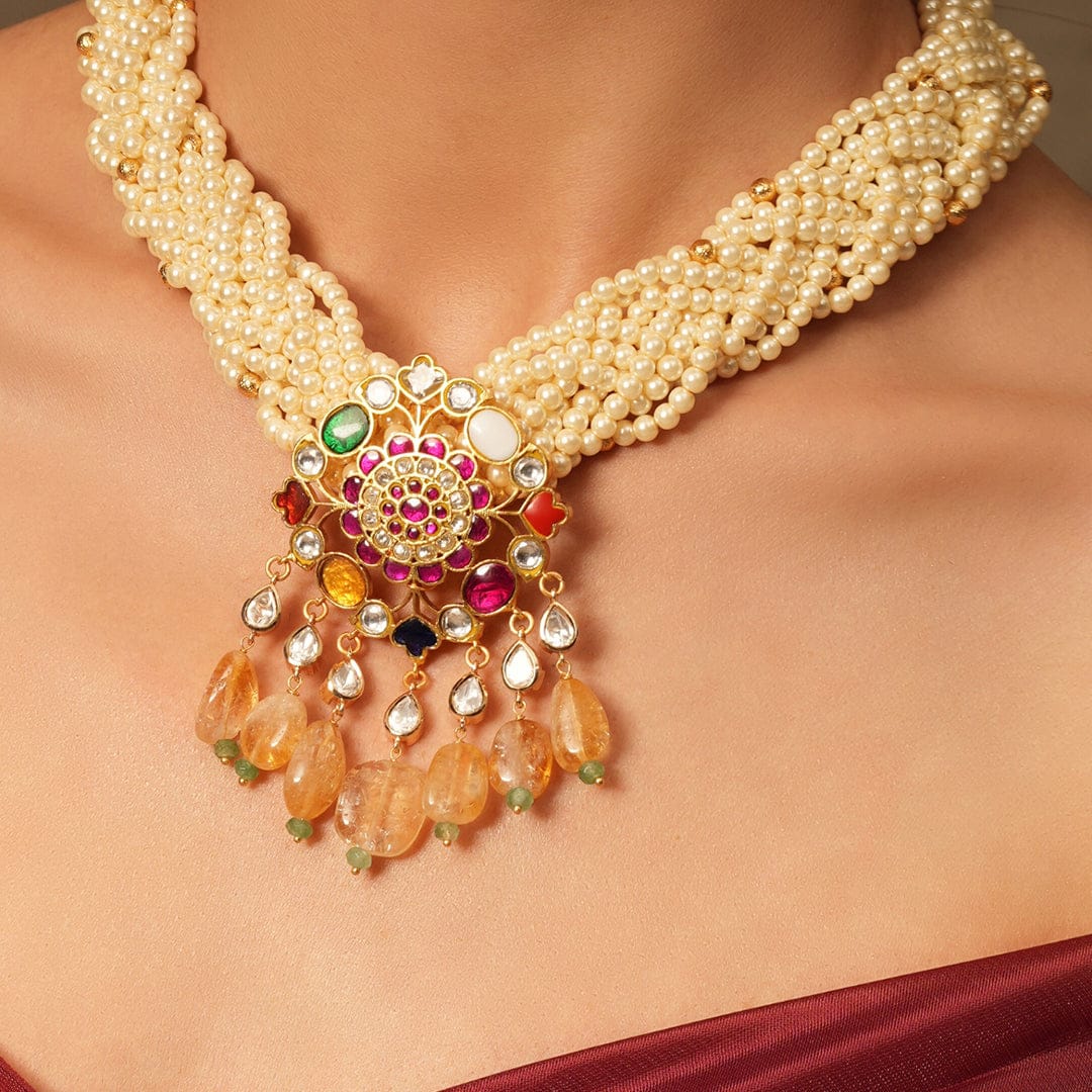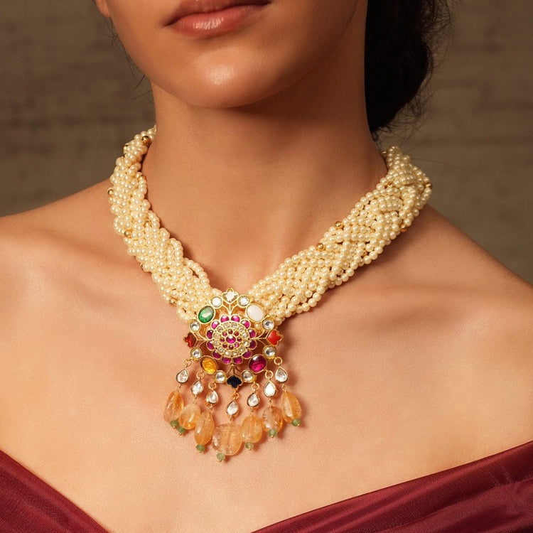 Regular price Rs. 6,930.00Description: A graceful design featuring twisted layers of delicate beads, adorned with a regal Rajwadi centerpiece pendant. This necklace blends timeless tradition with intricate craftsmanship, ideal for elevating festive ensembles.