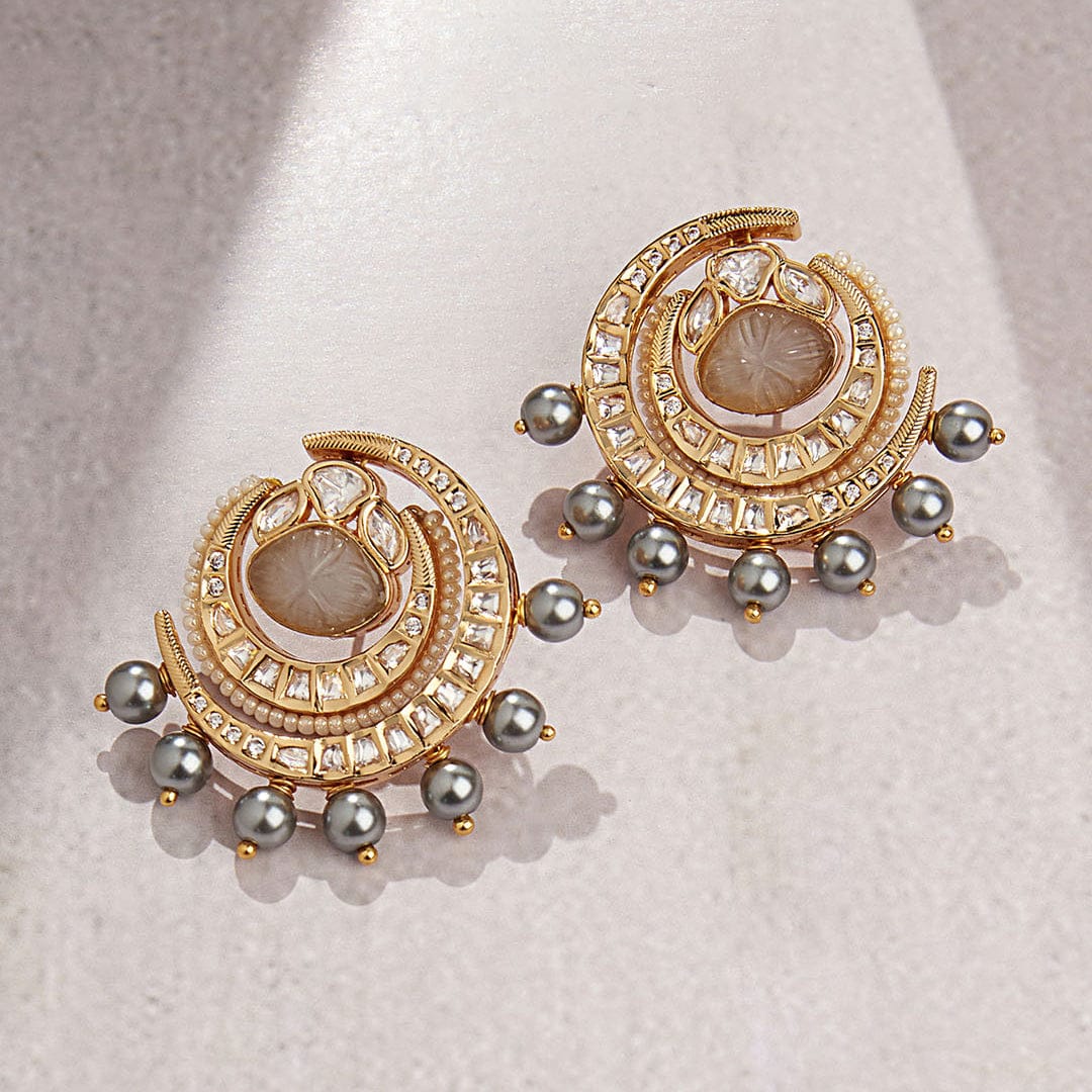 Regular price Rs. 5,950.00Description :Grace your ears with the timeless elegance of Kundan Polki Stud Earrings. Embellished with intricate polkis, grey pearls, and a central carved grey monalisa stone, these classic earrings are a refined choice for festive, wedding, and party occasions. Crafted with real semi-precious stones, they epitomize regal sophistication.