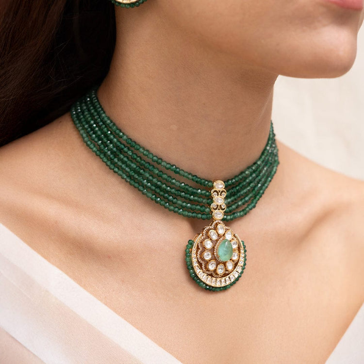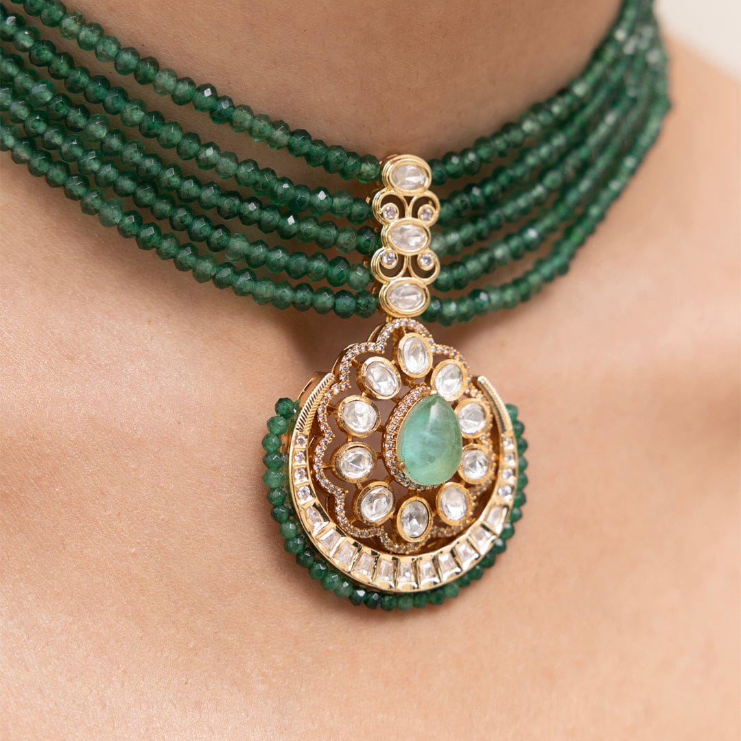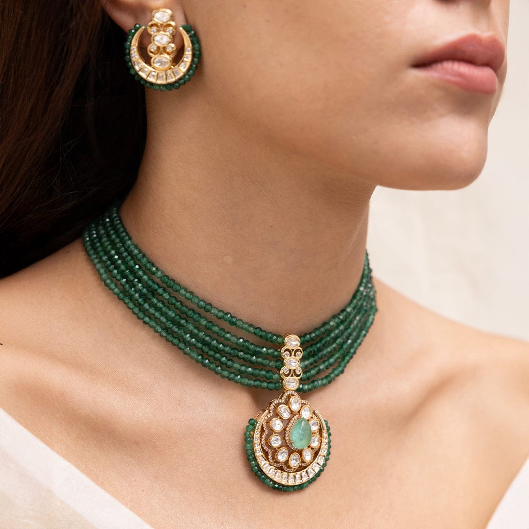 Description: An opulent choker woven with deep emerald green strands and crowned with a crescent-shaped pendant in kundan and pearls. It evokes the charm of royal soirées under moonlit skies. Perfect for sangeet nights and festive receptions steeped in grandeur.