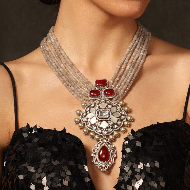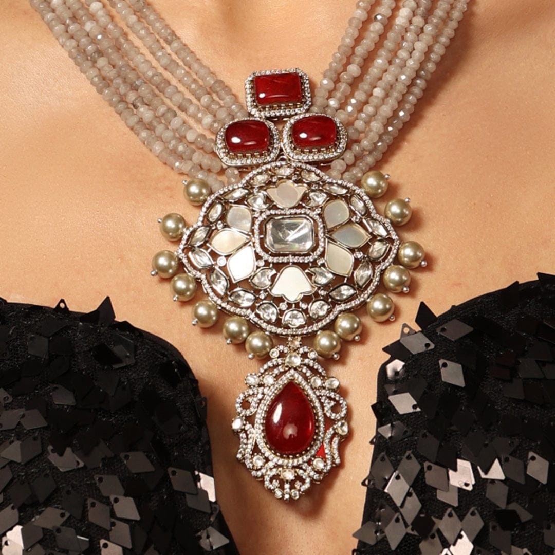 Description: Multiple strands of argent links culminate in a radiant gem focal point, orchestrating a symphony of tactile contrasts and vibrant hues that exude daring elegancea definitive declaration of style.