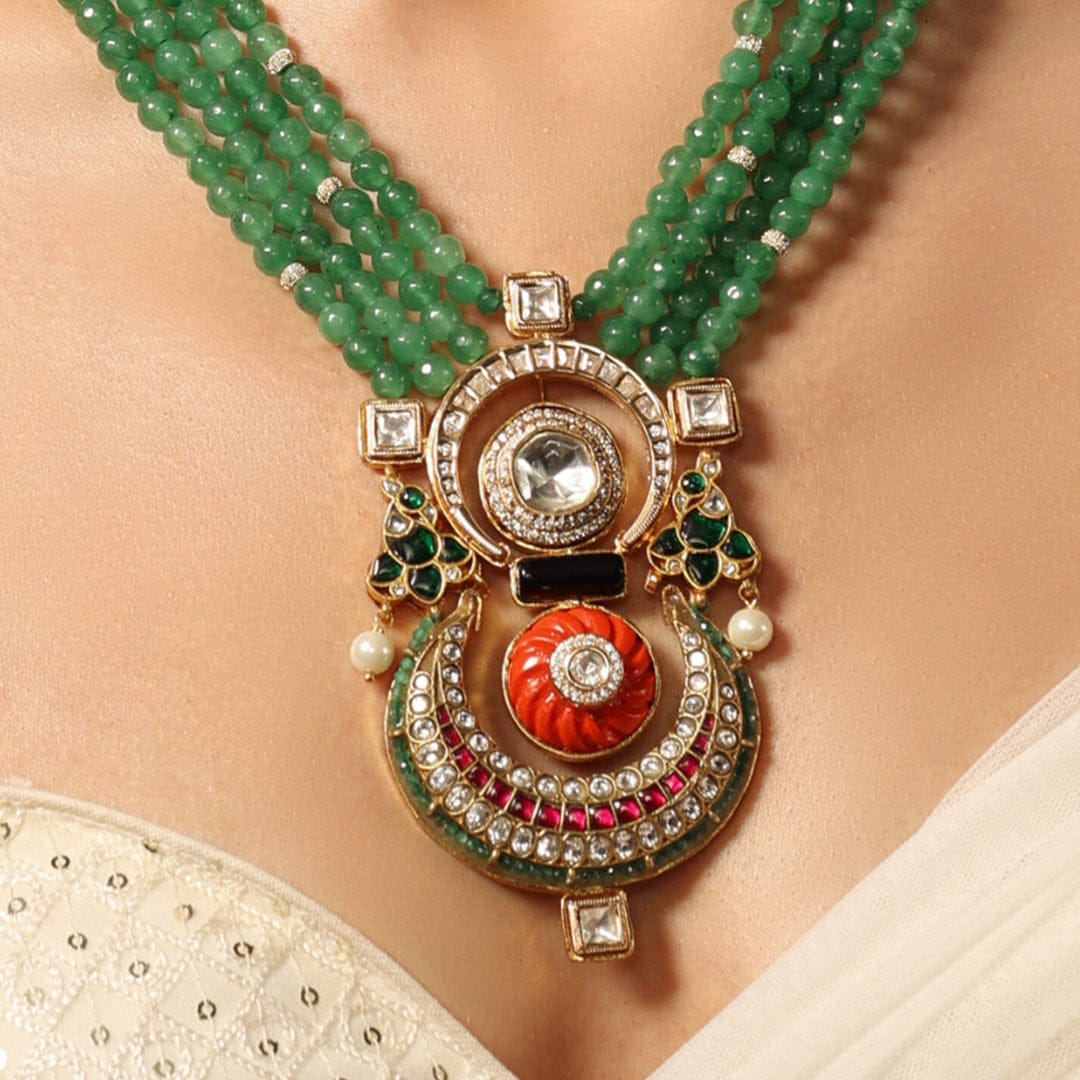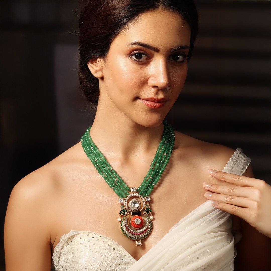 We use 22K Micron Gold Plating on brass, paired with high quality pearls, precious carved beads, semi precious stones, intricately hand painted with enamel, exquisite high quality pearls and high quality kundan that are celebrated for their durability and refinement - making every Joules by Radhika creation a piece that radiates brilliance and sophistication.