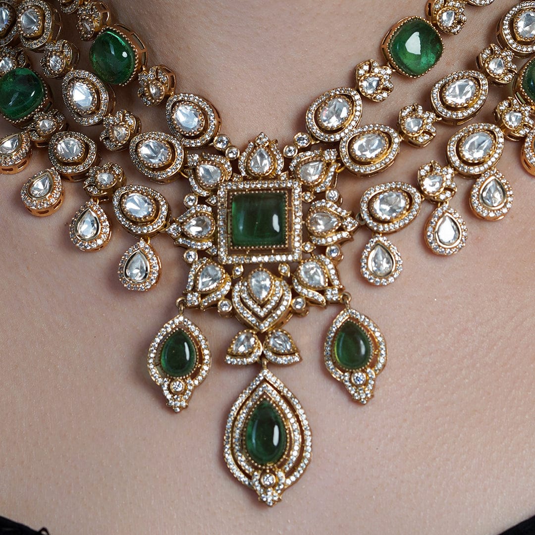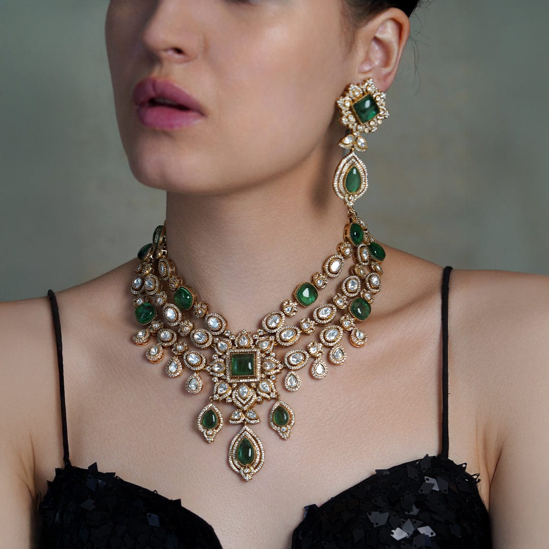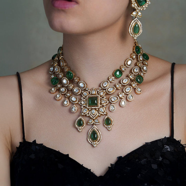 Description: Gorgeous Emerald Bridal Necklace Set is a masterpiece of bridal luxury, adding stunning emeralds for an unforgettable royal look.