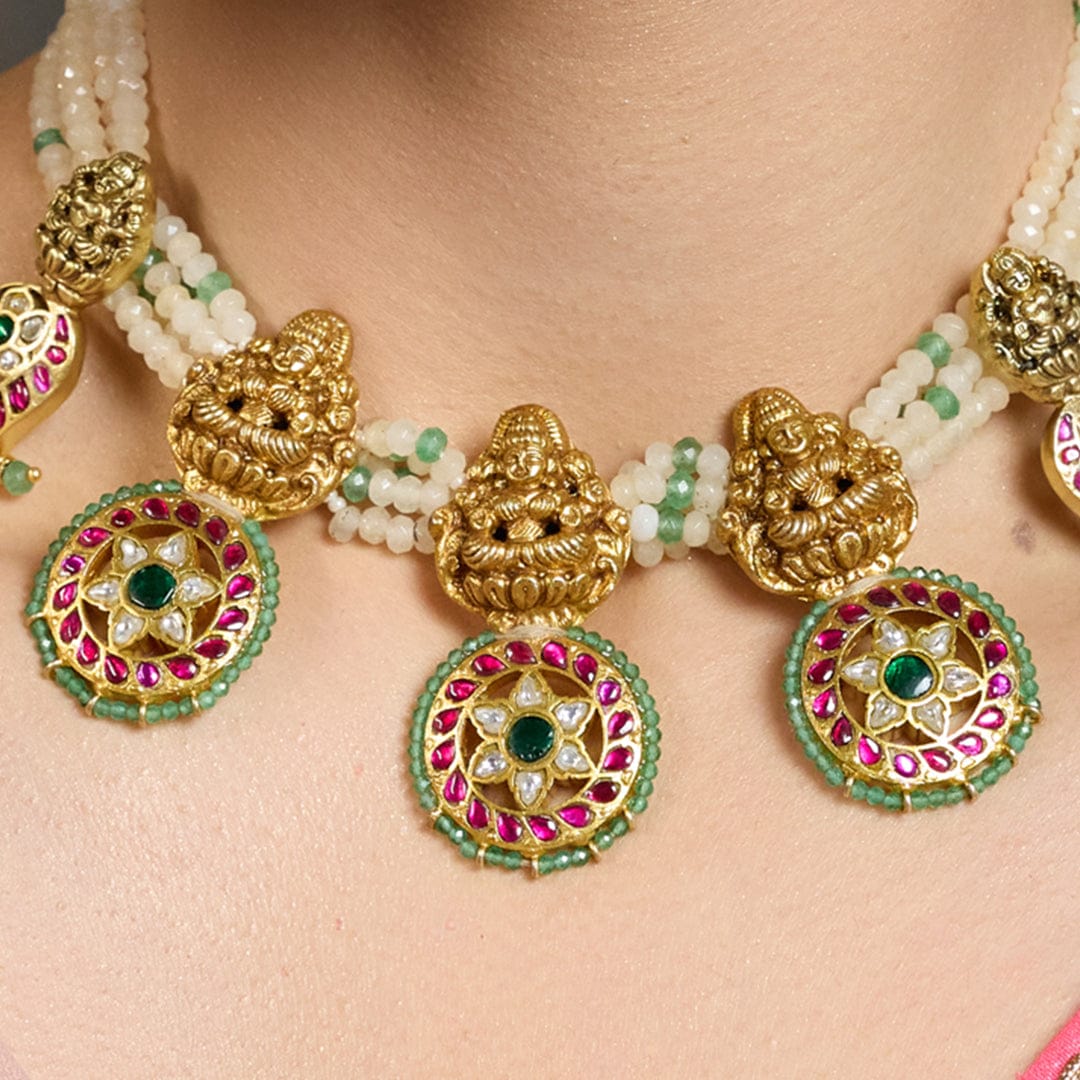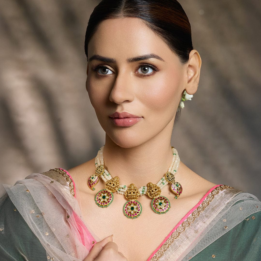 We use 22K Micron Gold Plating on brass, paired with high quality pearls, precious carved beads, semi precious stones, intricately hand painted with enamel, exquisite high quality pearls and high quality kundan that are celebrated for their durability and refinement - making every Joules by Radhika creation a piece that radiates brilliance and sophistication.