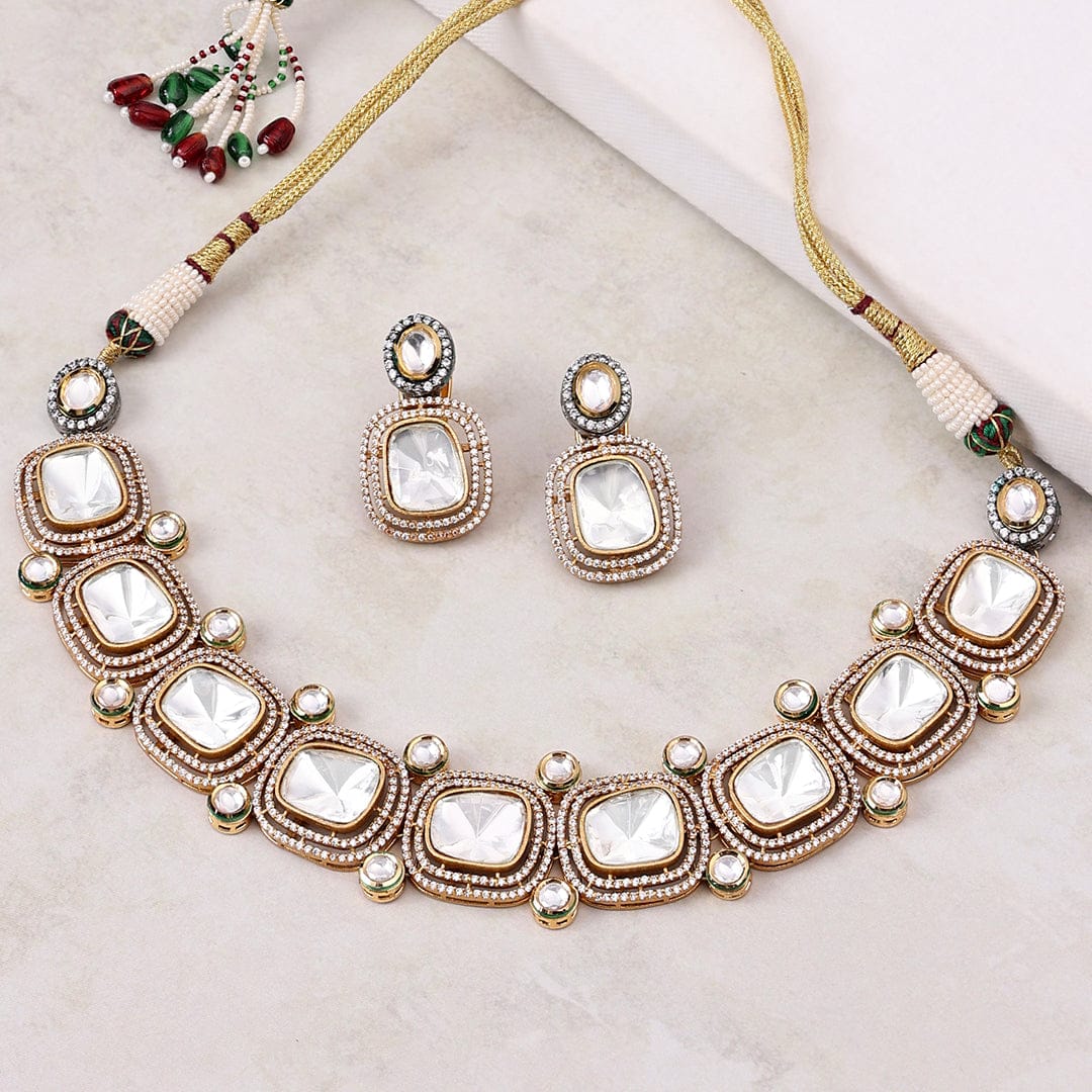 Description: Embrace elegance with the Gold Tone Polki Necklace Set, featuring handcrafted gold-toned pieces with large polkis at the apex and surrounded by cubic zirconia stones. Perfect for festive, wedding, and party occasions, enhancing your Indian and fusion attire. Crafted with the highest quality materials, ensuring a regal look and feel. Product Code: JAJBR23NS 28
