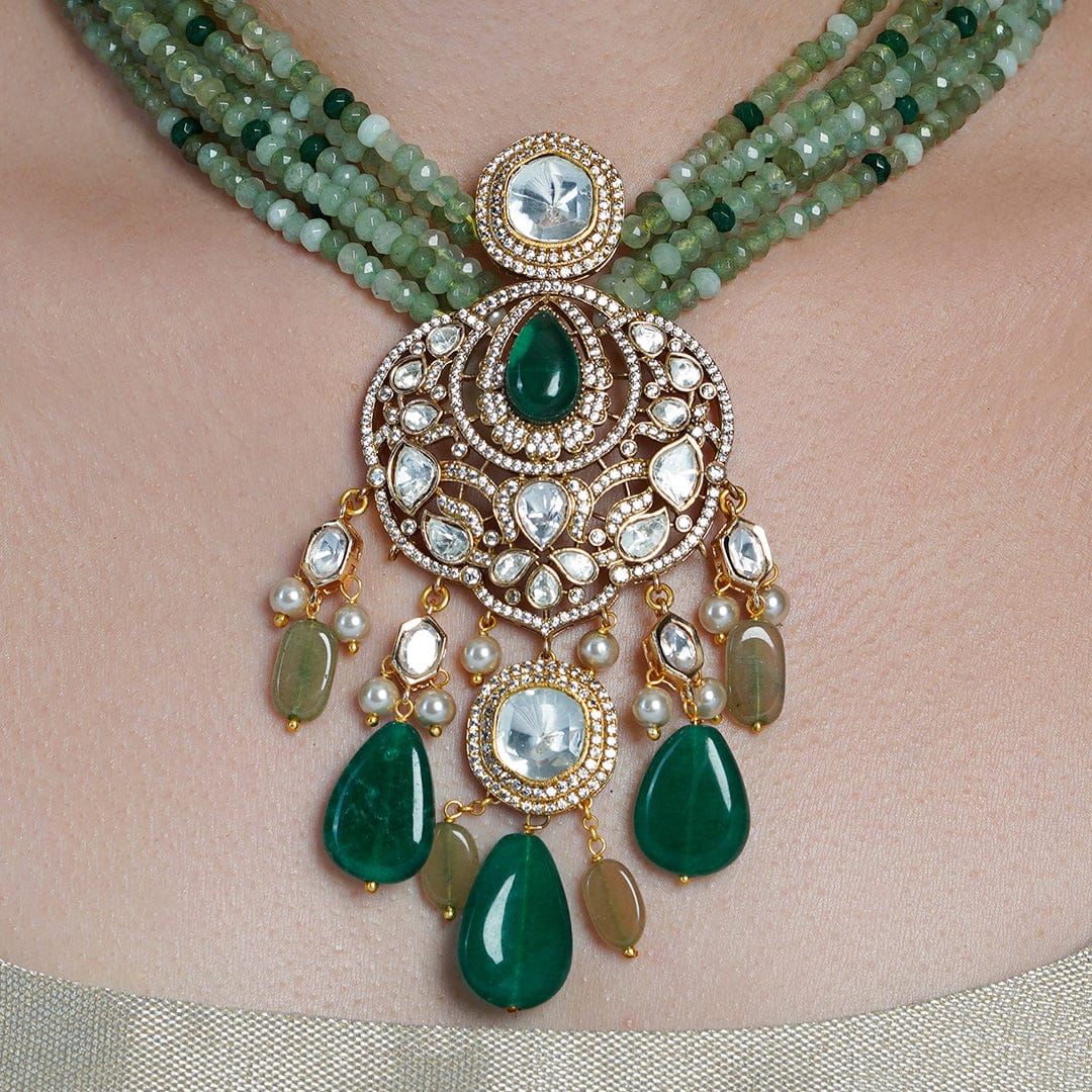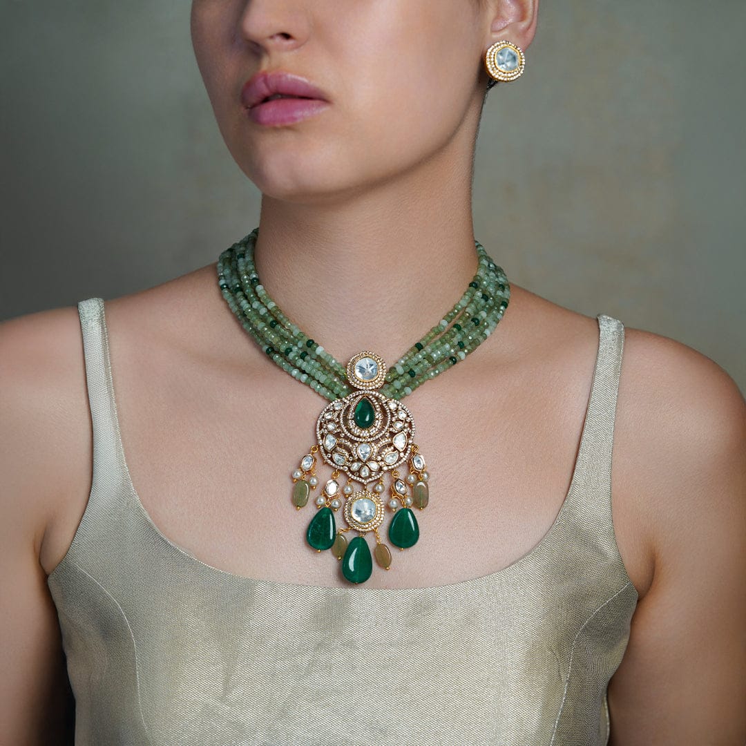 Description: Make a regal statement with the Jade Polki Emerald Drop Necklace Set—a luxurious necklace set adorned with Polki stones and emerald drops for graceful allure.