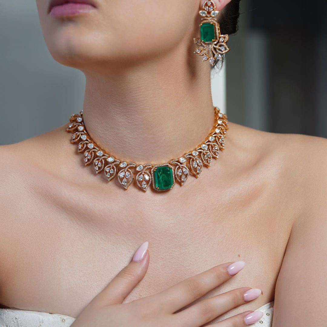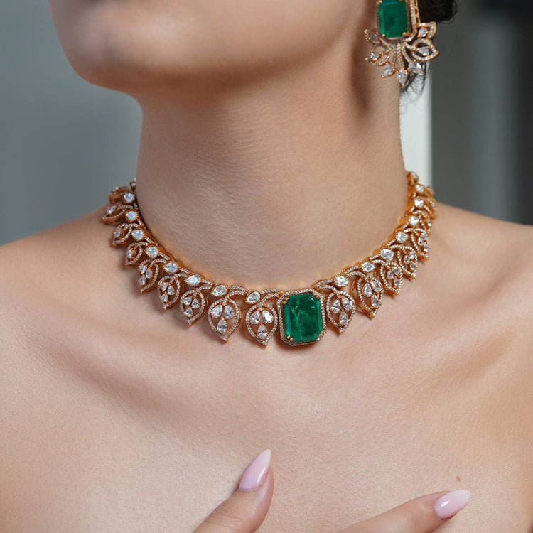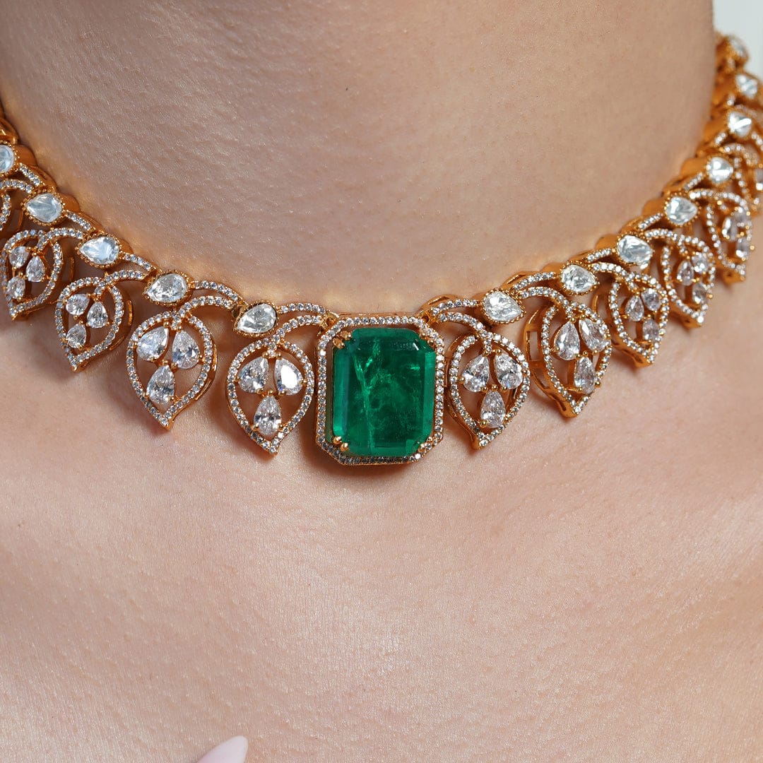 Description: Embrace nature's elegance with the Leaf Aura Emerald Choker Set, featuring striking green emeralds in a charming leaf motif with matching drop pieces.