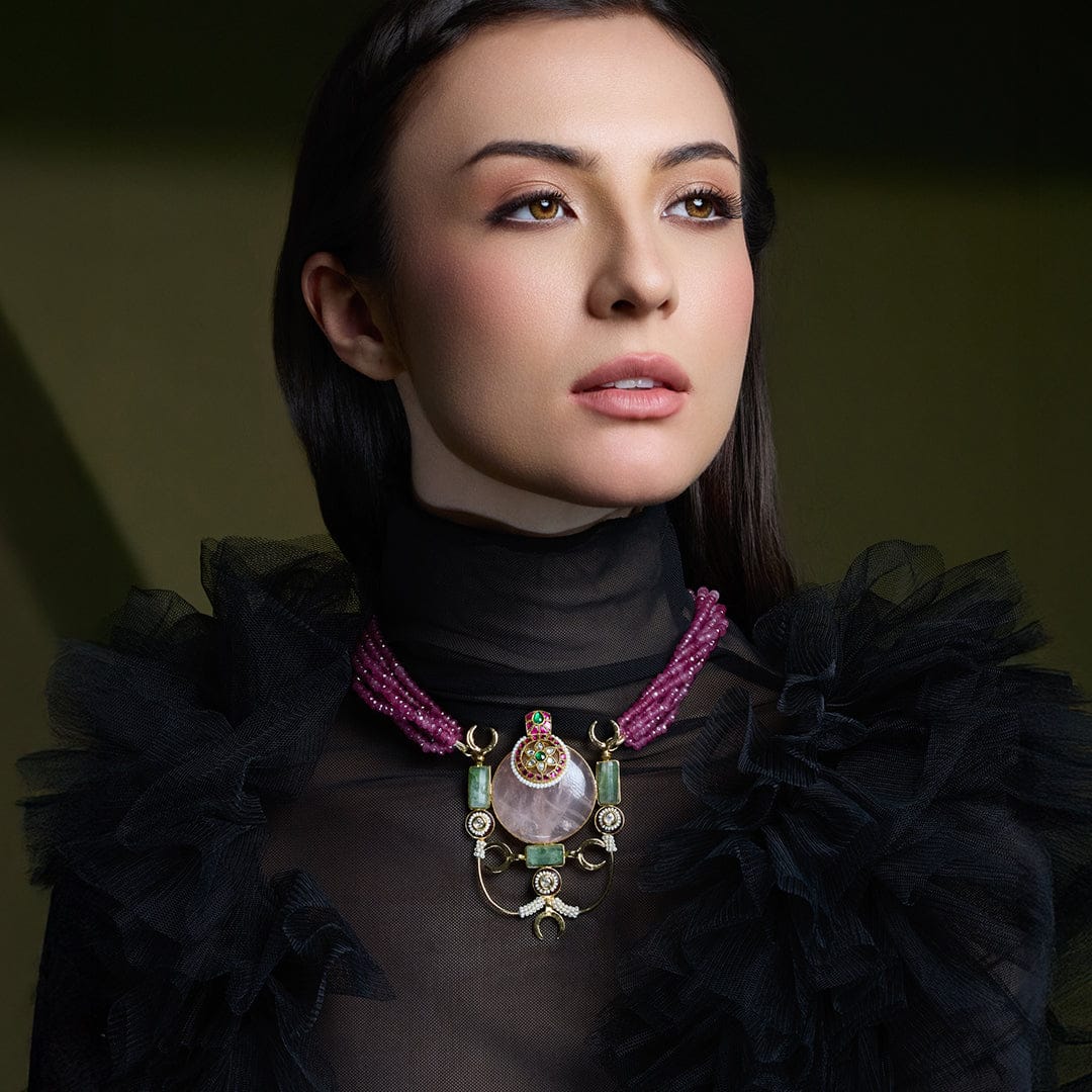 Description: Adorned with intricate beads and a majestic centrepiece, this statement necklace adds a regal touch to any outfit. Perfect for weddings or festive occasions..