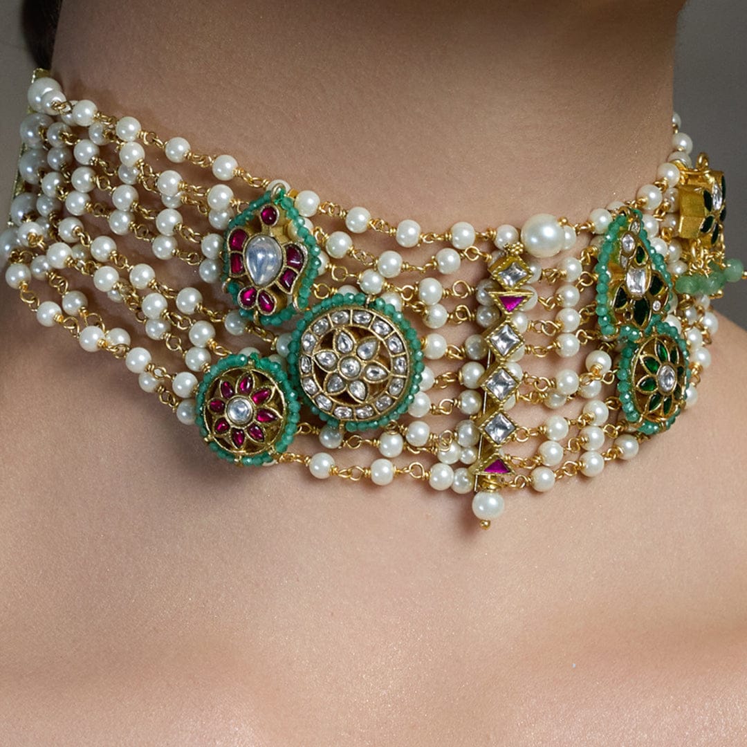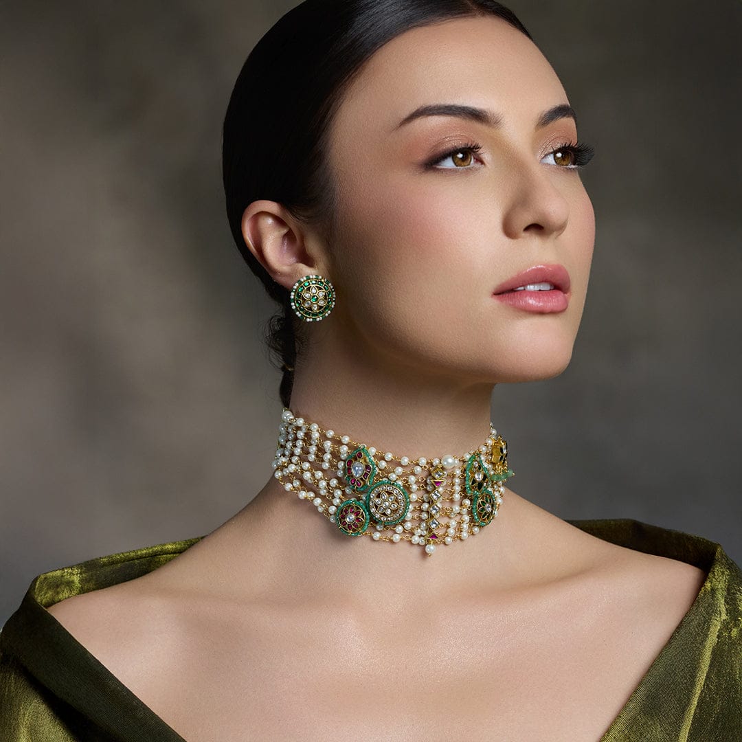 Description: A stunning pearl choker with intricate green-gold accents and matching earrings—crafted to exude royal elegance for weddings, festivities, and grand celebrations.