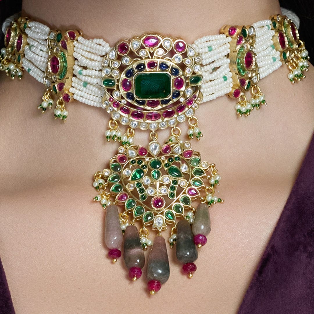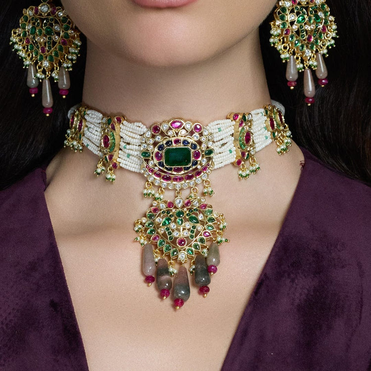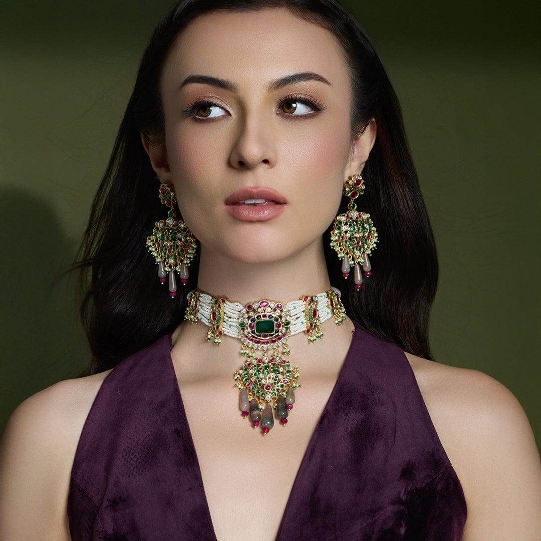 Description: Gorgeous choker-style necklace with pearl strings, green and red Kundan stones, and detailed matching earrings. Ideal for bridal or festive wear, offering a regal and elegant statement look.
