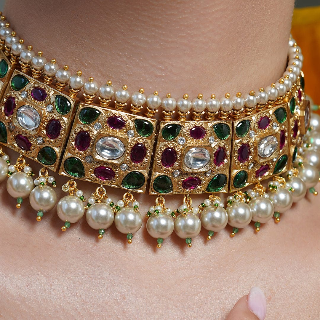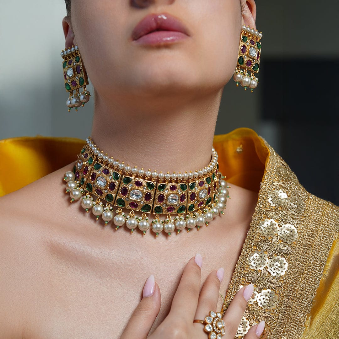 Description: The Ruby Grid Pearl Choker Set has with sophisticated design with striking red rubies in a structured grid pattern, complemented by lustrous pearls.