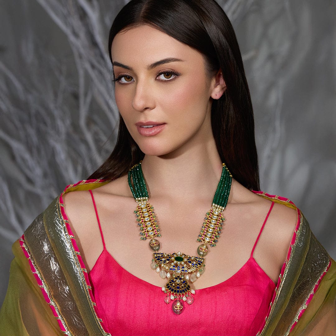 Description: Unique necklace with bold green and pink beaded sections, accented by a detailed central pendant. Ideal for ethnic and fusion outfits, offering vibrant elegance and artisanal charm.