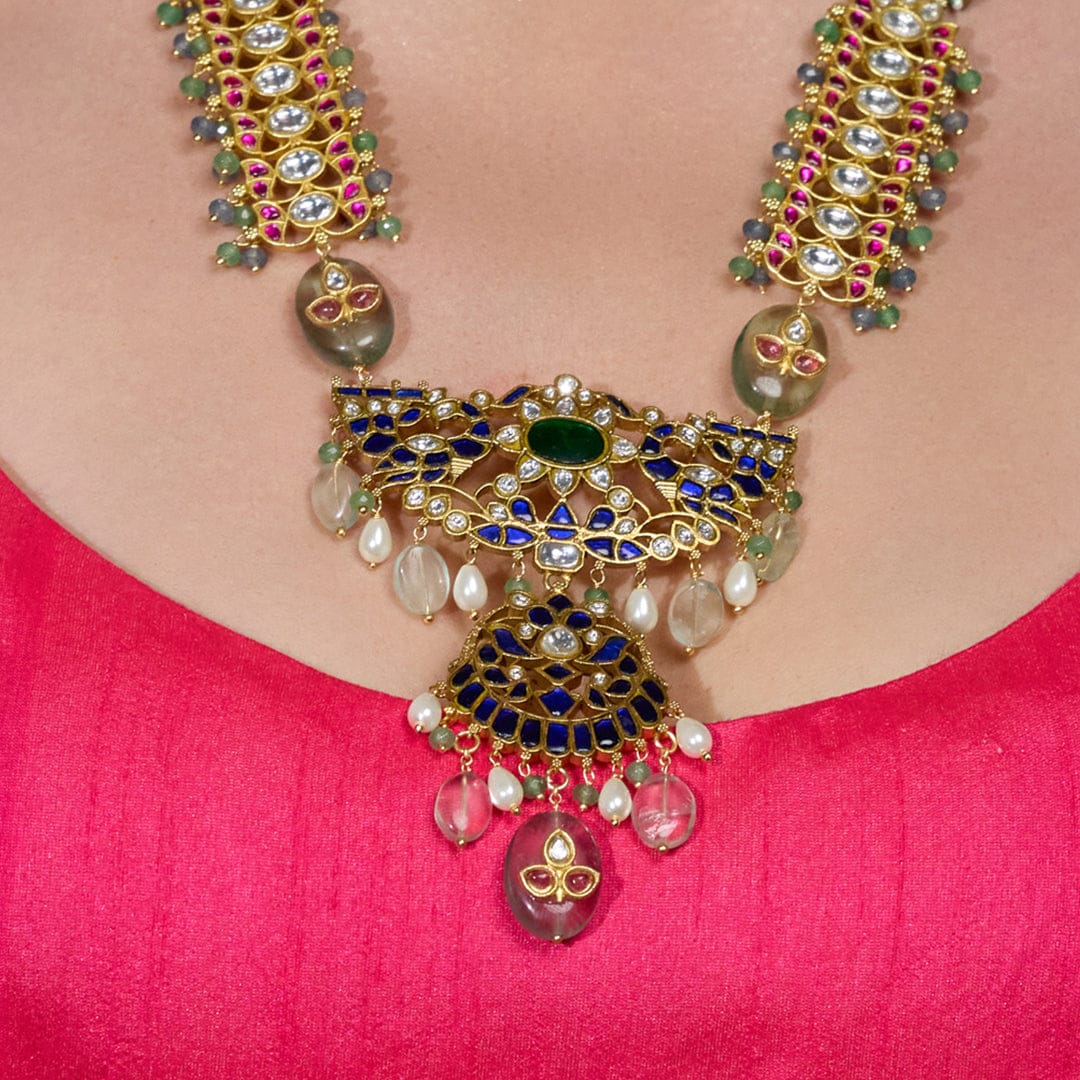 We use 22K Micron Gold Plating on brass, paired with high quality pearls, precious carved beads, semi precious stones, intricately hand painted with enamel, exquisite high quality pearls and high quality kundan that are celebrated for their durability and refinement - making every Joules by Radhika creation a piece that radiates brilliance and sophistication.