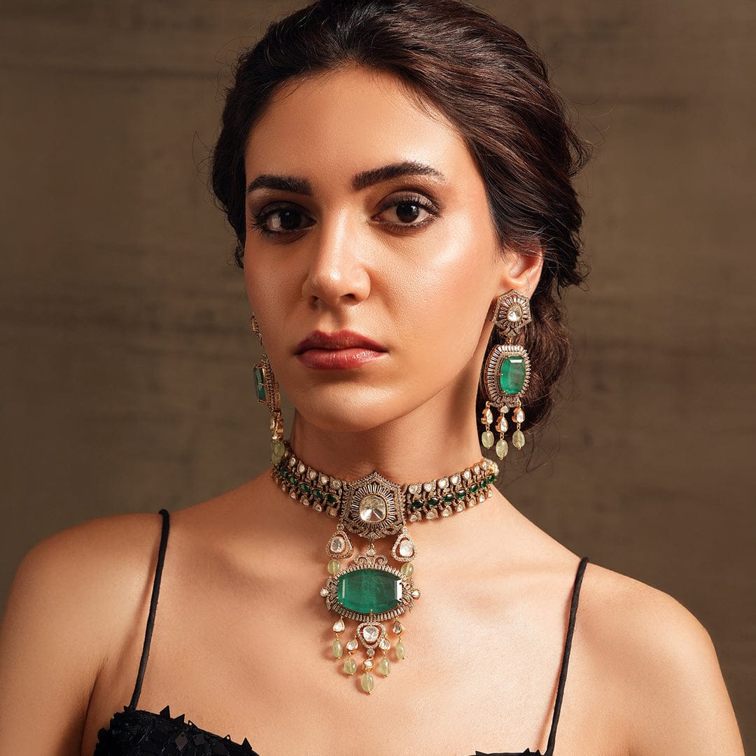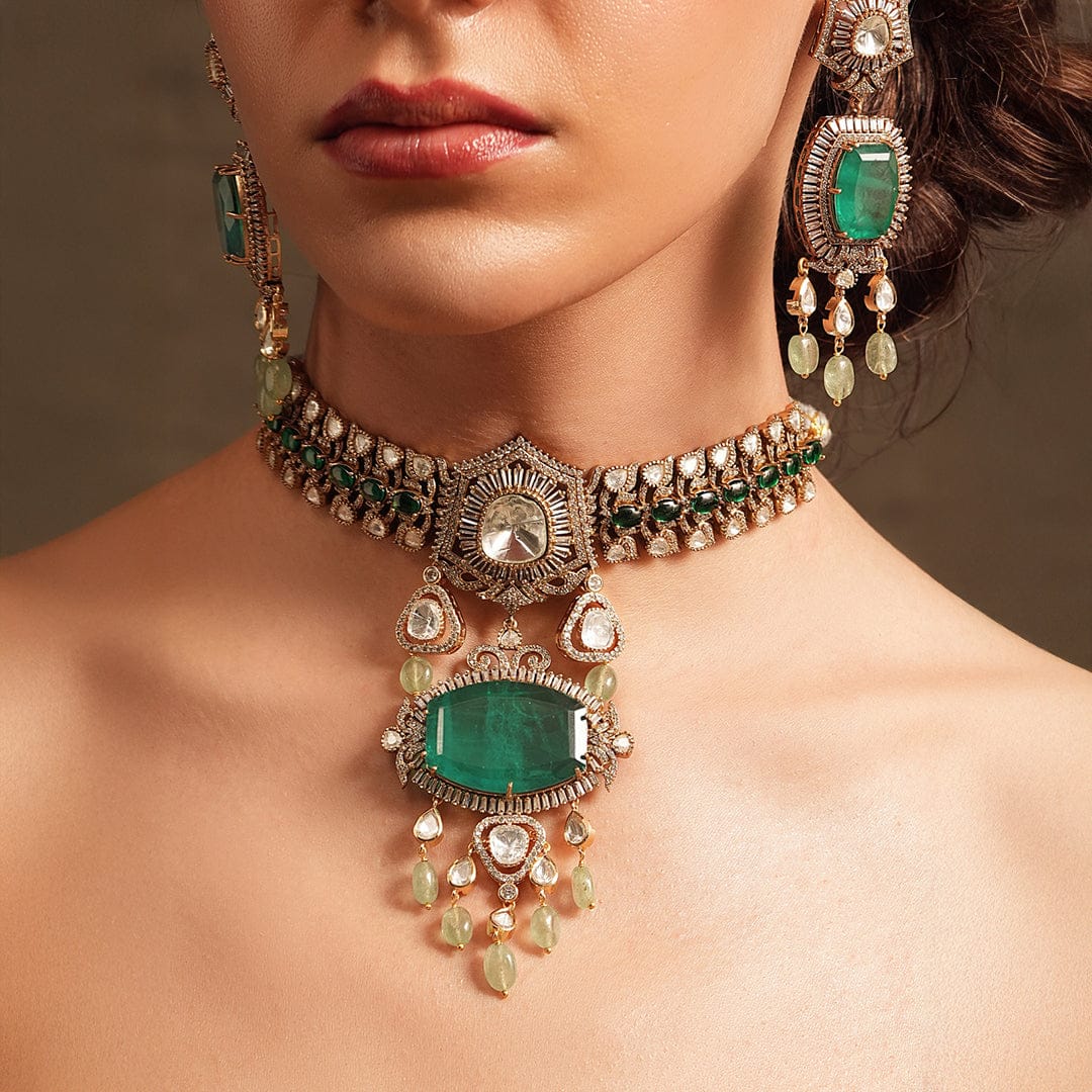 Description: This green Victorian-style antique choker necklace set radiates a regal allure. Featuring an intricate design with antique-finish details and vivid green stones, it exudes a vintage charm that pairs beautifully with both traditional and modern ensembles. Accompanied by matching earrings, this set is a refined choice for those seeking timeless sophistication.