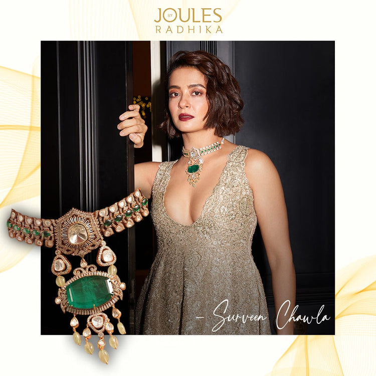 We use 22K Micron Gold Plating on brass, paired with high quality pearls, precious carved beads, semi precious stones, intricately hand painted with enamel, exquisite high quality pearls and high quality kundan that are celebrated for their durability and refinement - making every Joules by Radhika creation a piece that radiates brilliance and sophistication.