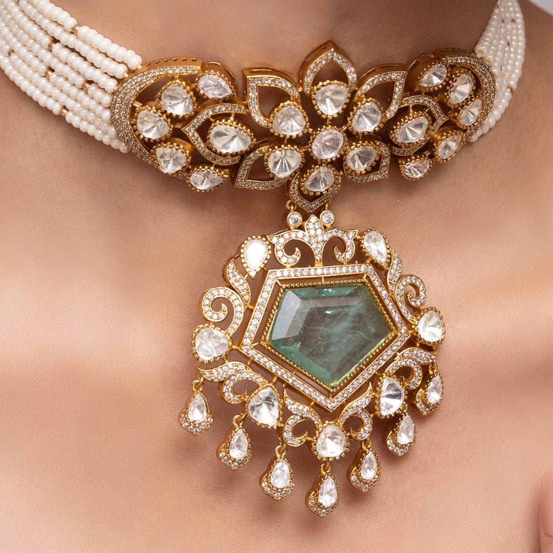 Description: A regal choker set featuring pearl rows, kundan detailing, and a prominent green center pendant framed in gold. Paired with matching earrings, this ensemble is perfect for bridal ceremonies or elegant festive evenings.