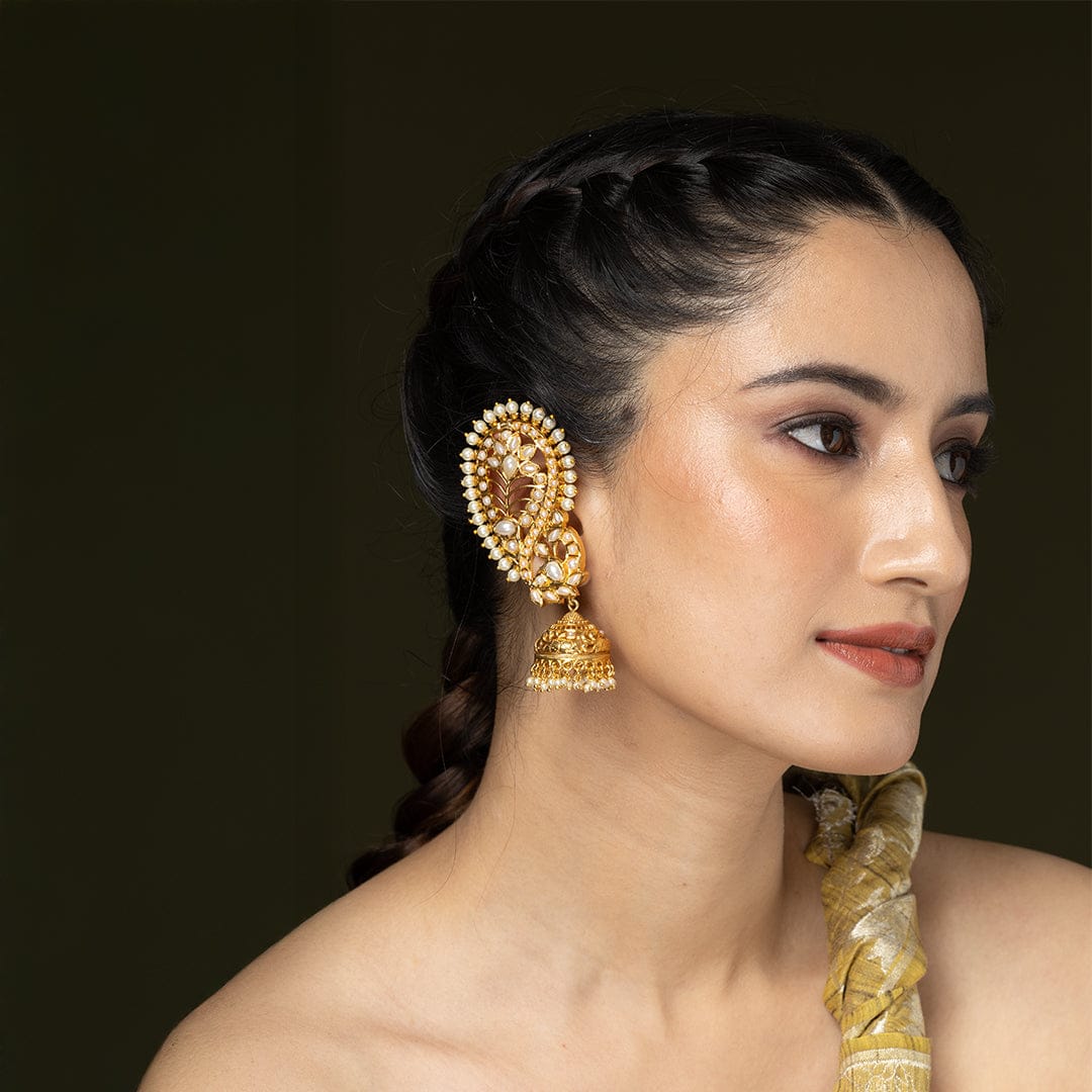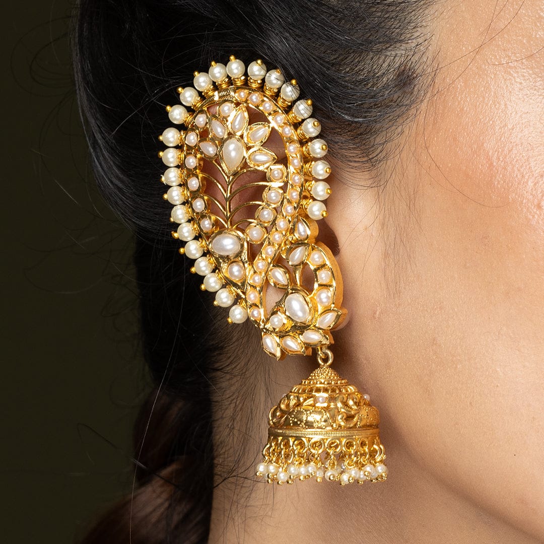 Description: These traditional White and Gold cuff Earrings feature a lovely white studded peacock design leading to a gold bell drop. This upper portion is meticulously adorned with a delicate fringe of tiny ivory pearls bordering a detailed, dark inner pattern, creating a beautiful contrast against the warm gold base.