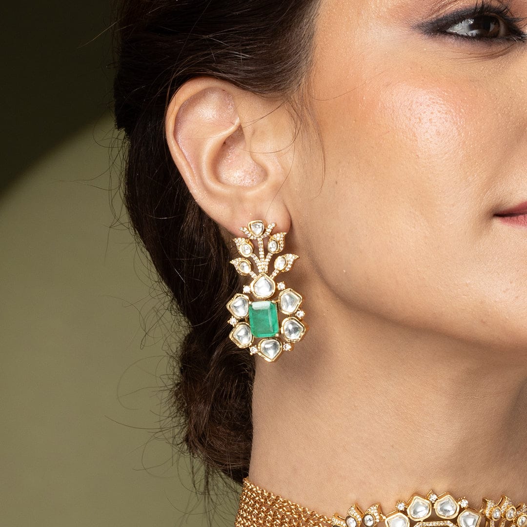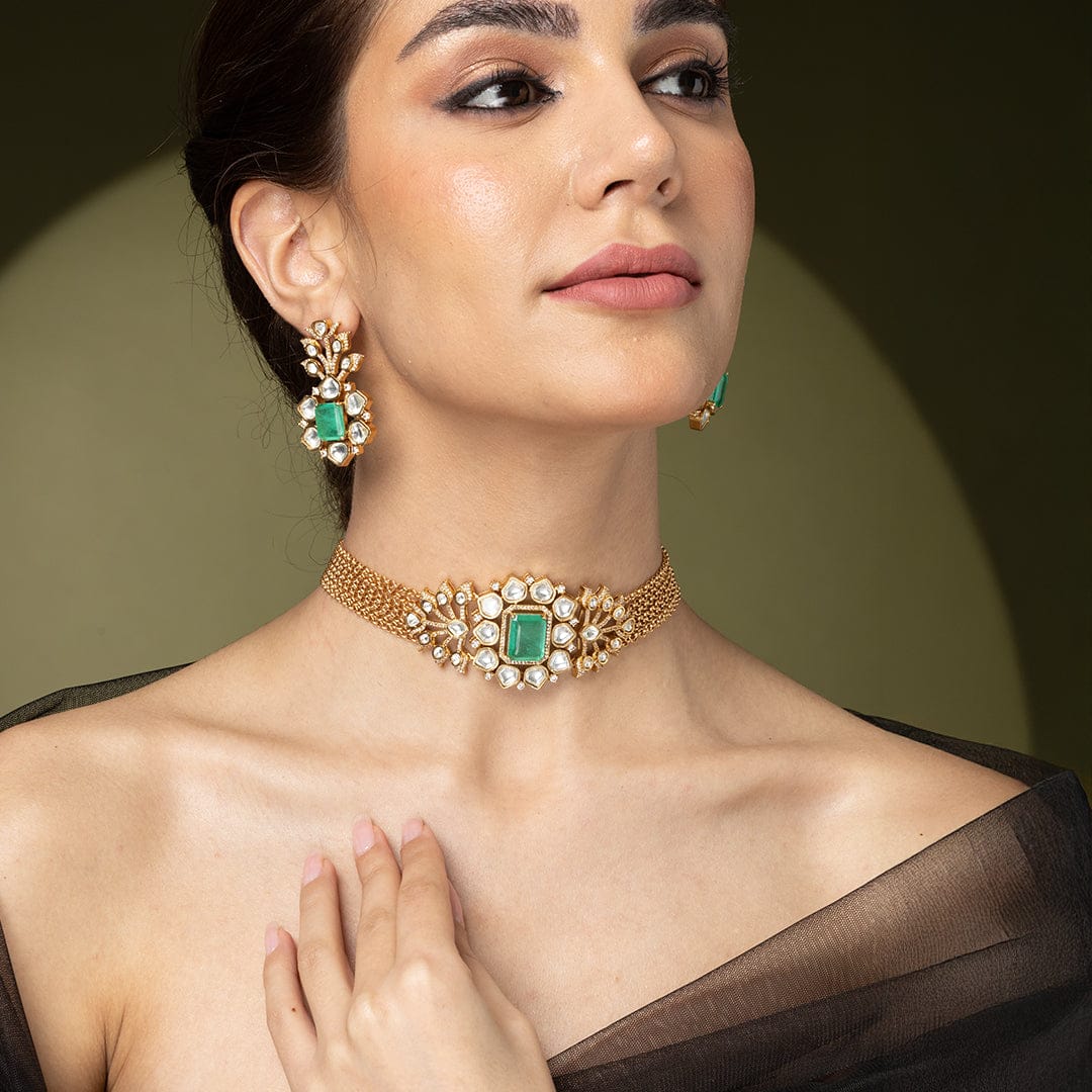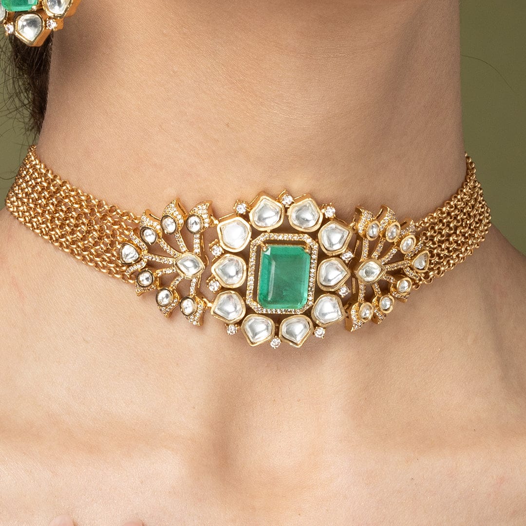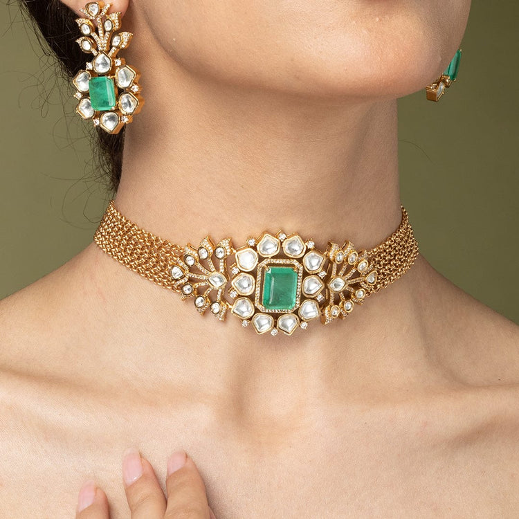 Description: A luxurious, broad mesh choker necklace set featuring a magnificent central emerald-green stone framed by intricate, sparkling Kundan work. Paired with exquisite, matching drop earrings.