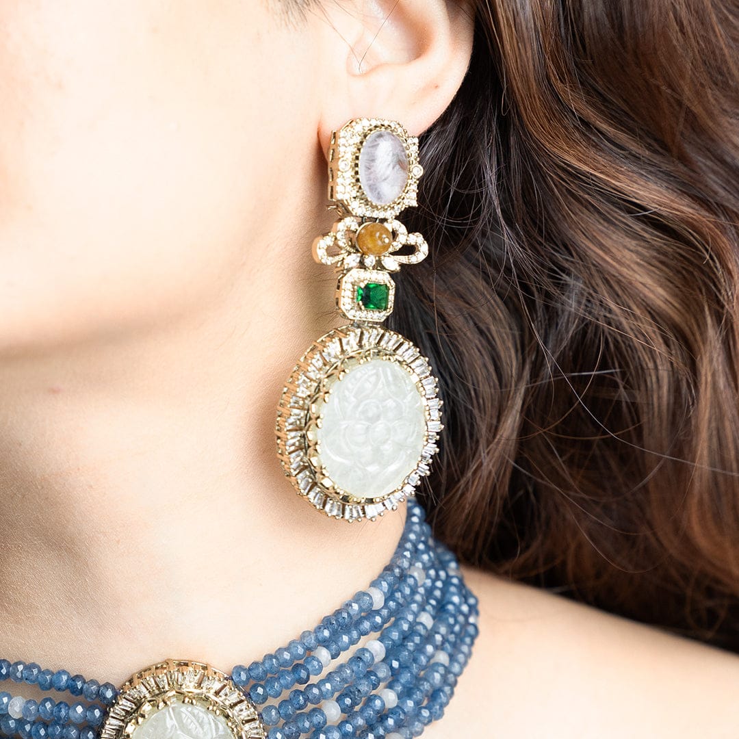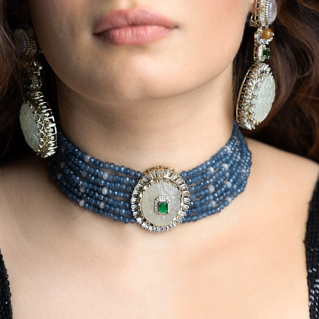 Description: This necklace set features a multi-strand blue bead choker centered with an oval white medallion and emerald accent, paired with matching oversized drop earrings.